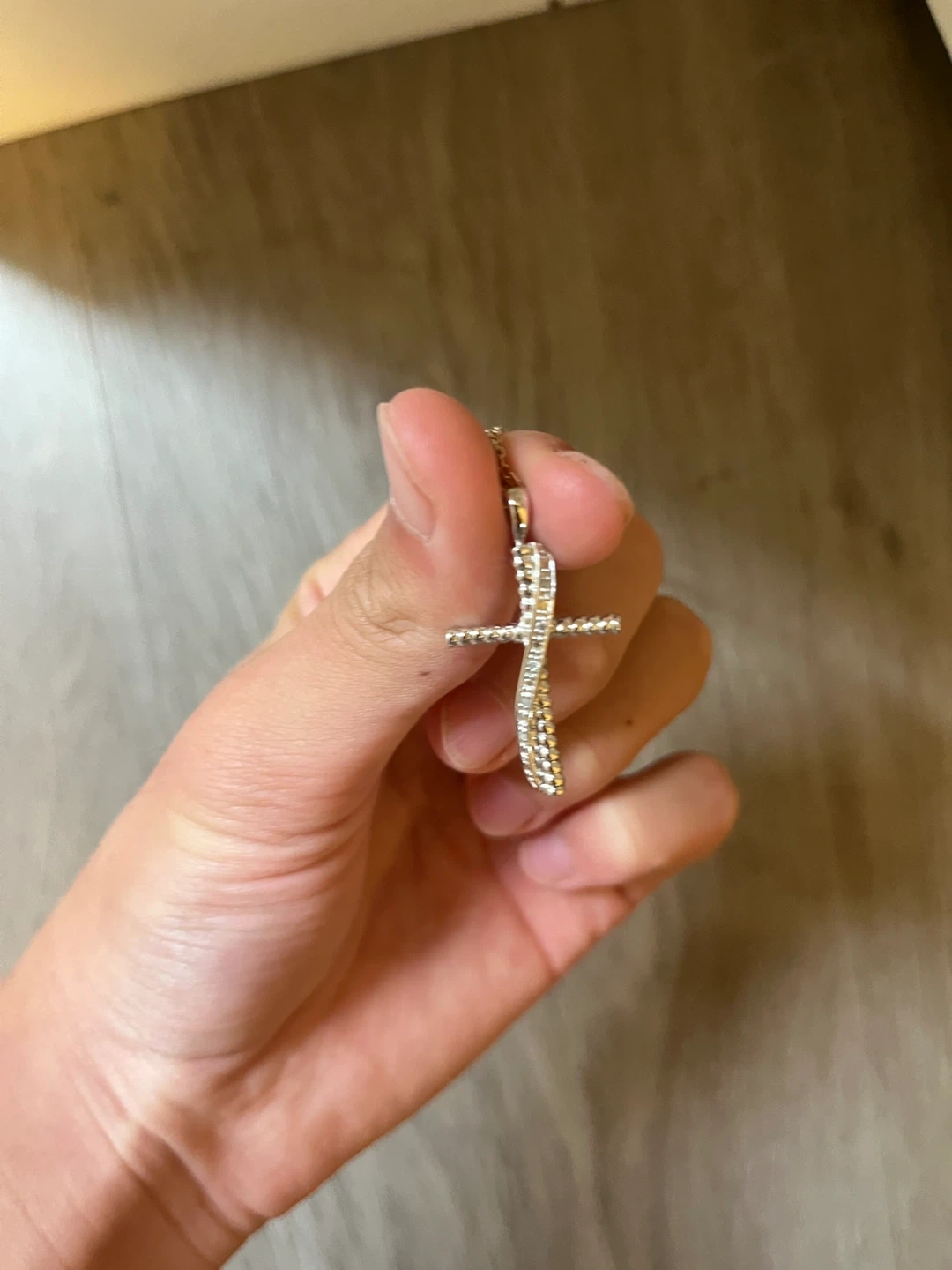 Selling a delicate cross pendant necklace. It features a beautiful design. Real full diamond, full 925 silver, like brand new. No flaws, no scratches.