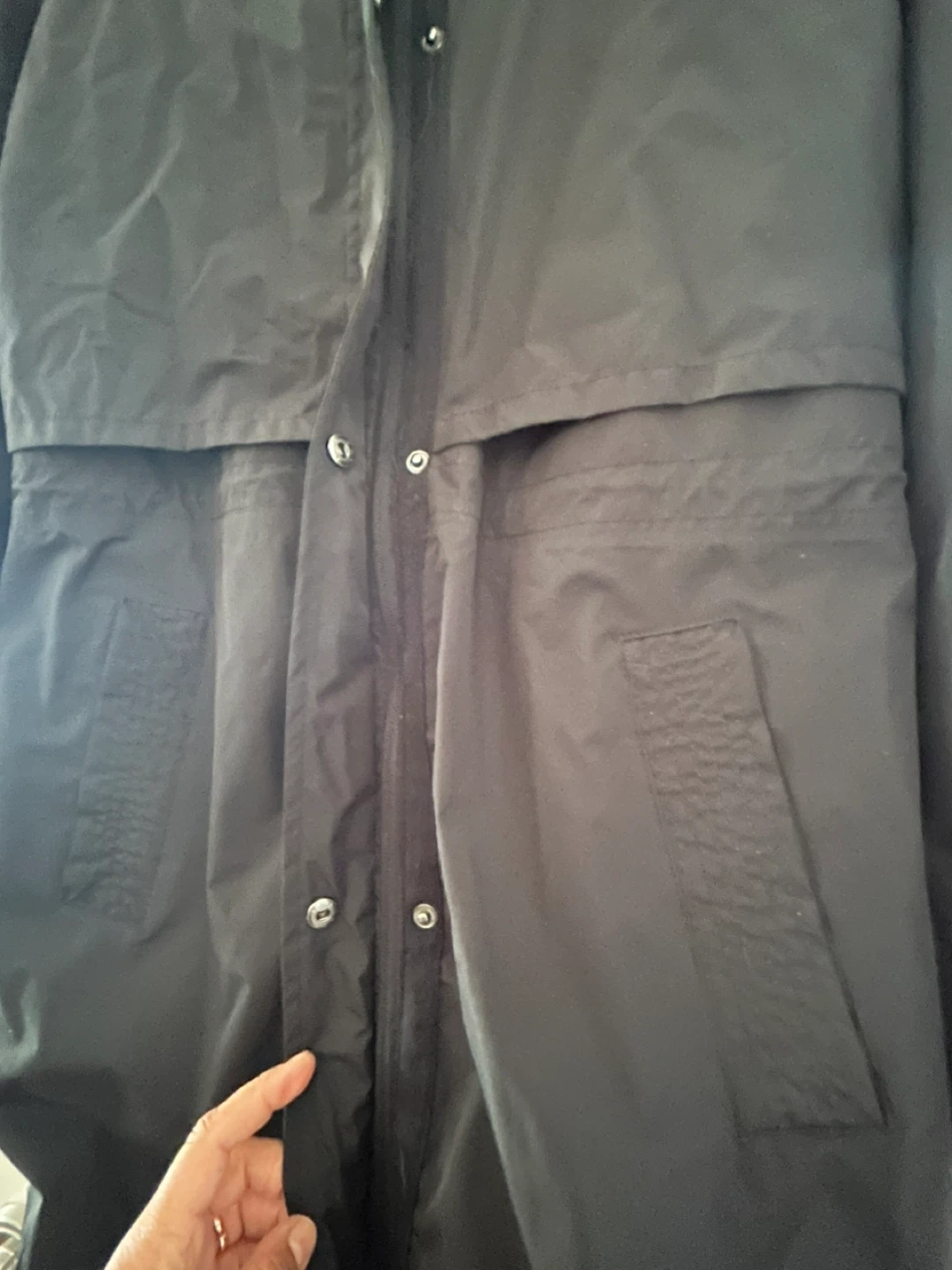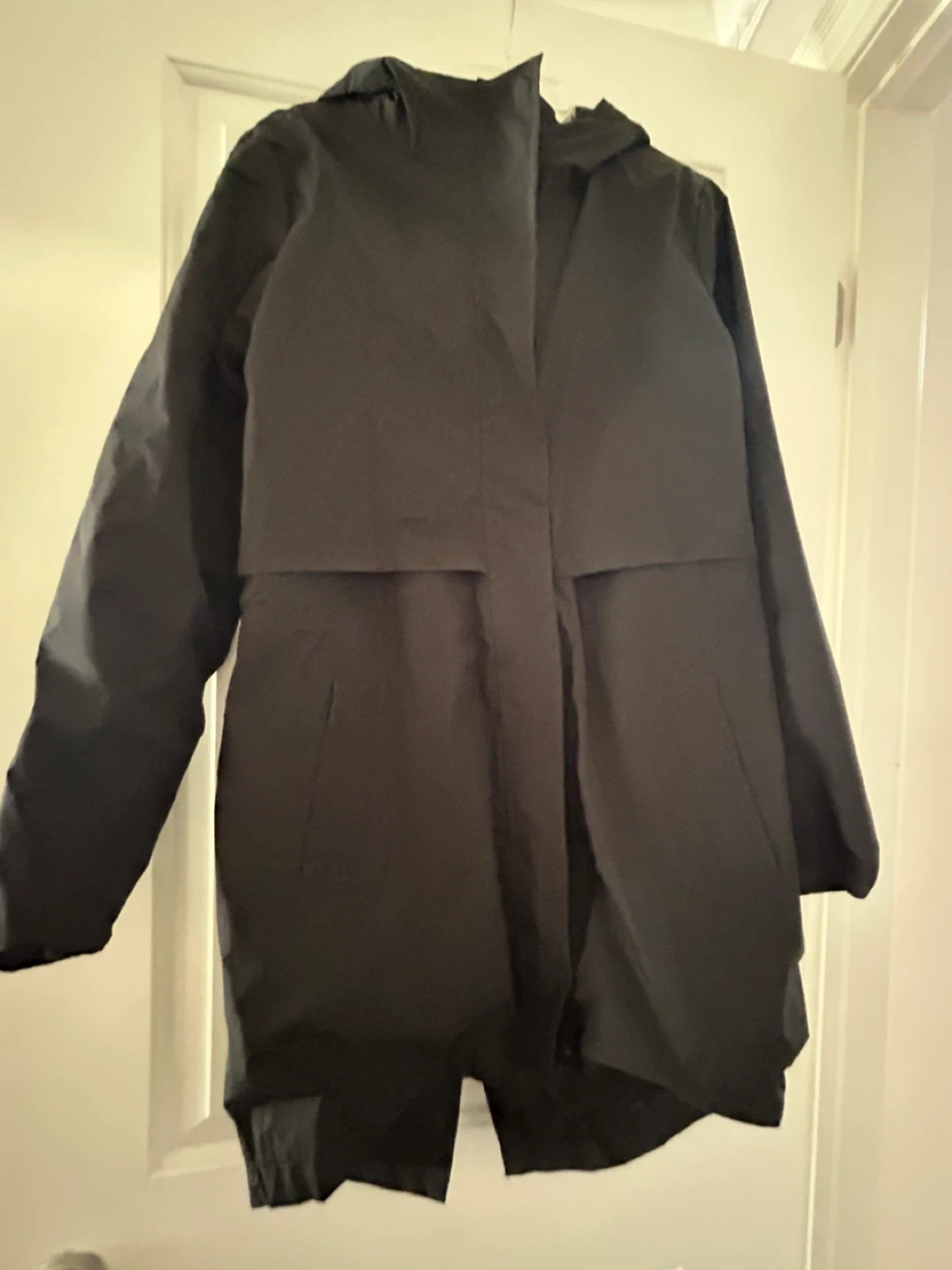 Selling a black hooded rain jacket. Size small women’s By Mondetta It's in excellent condition and perfect for those rainy days! The jacket has a hood and pockets, making it both practical and stylish mesh interior and lightweight.