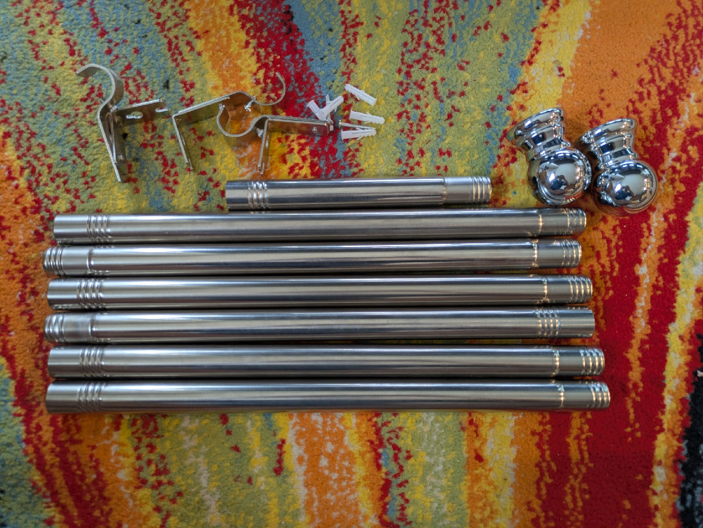 Selling a complete curtain rod set, perfect for adding a touch of elegance to your windows! This set includes all the necessary components for easy installation. The set includes multiple rod pieces, decorative end caps, mounting brackets, and wall anchors. Everything you need to get your curtains up in no time!