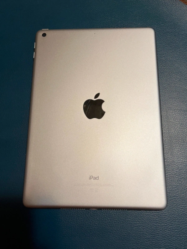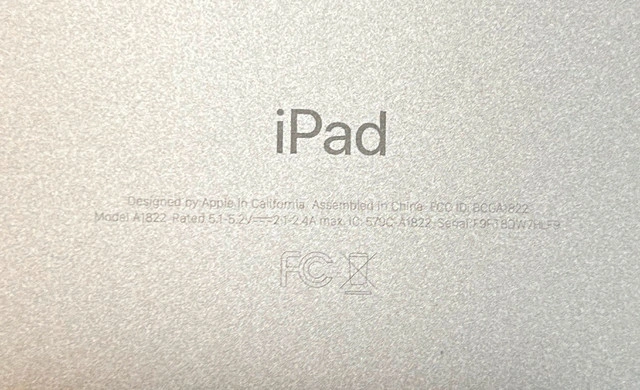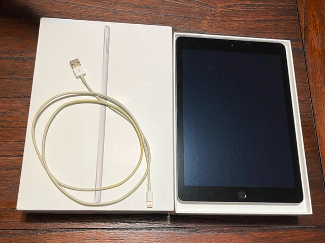 Apple iPad A1822 5th generation tablet. 32GB. Silver color. With box, instructions, stickers, and cord (USB/Lightning cable). Good condition, battery fine, glass fine, working fine. Adult owned. Handy for checking your email and doing some work, reading books, games, and more. $240. Near the Burlington/Oakville border or possibly some availability at Union Station.