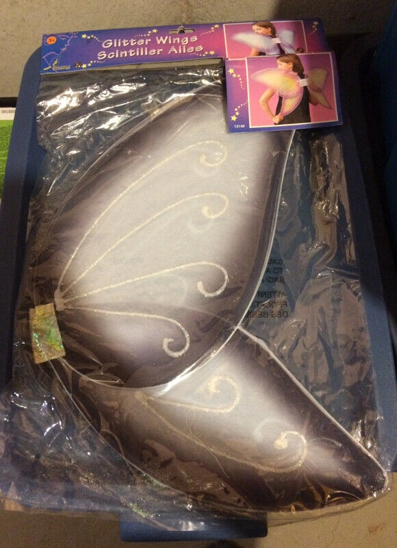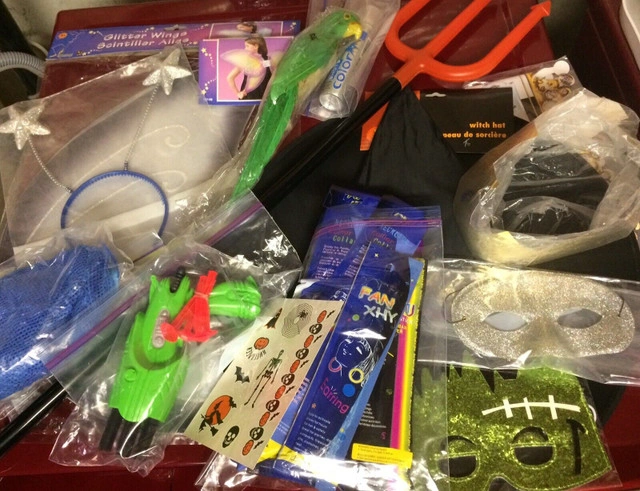 15Halloween costume ideas, accessories for sale. Devil pitchfork never used, witch hat new with tags, fairy wings new in package (about 19” tall), Frankenstein mask new in package, glitter mask, gold crown handmade of bristol board needs jewels re-glued, blue hair color never used, parrot for pirate never used, alien star headband, long blue wig, ray gun and darts, temporary tattoos never used, and new glowing earrings, glasses, necklaces, and bracelets. Great to have on hand for last minute Halloween costume for the office, dress up, cosplay, costume parties, etc. $15/all. Near the Burlington/Oakville border. No delivery.