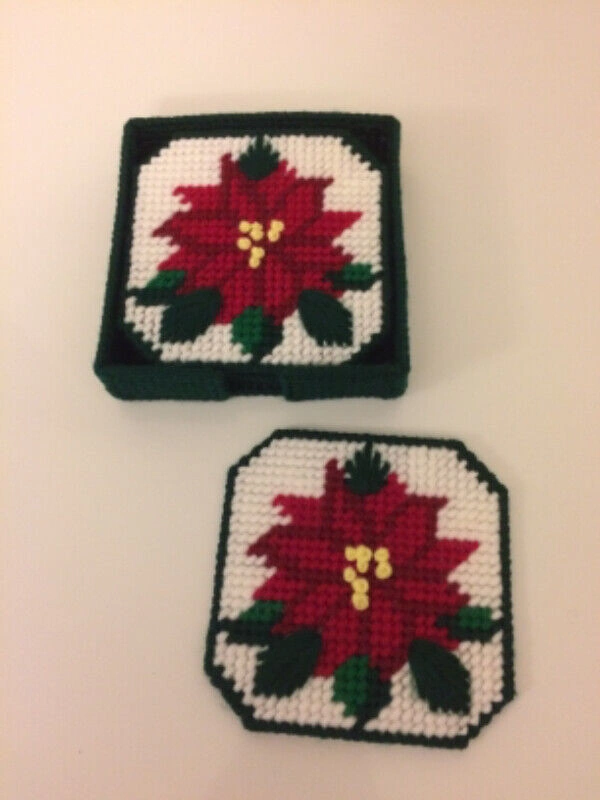 Christmas poinsettia drink coasters for sale. New. Set of four decorative coasters plus holder. Great for protecting your table, holiday home decor, gift, and more. $15. Near the Burlington/Oakville border.