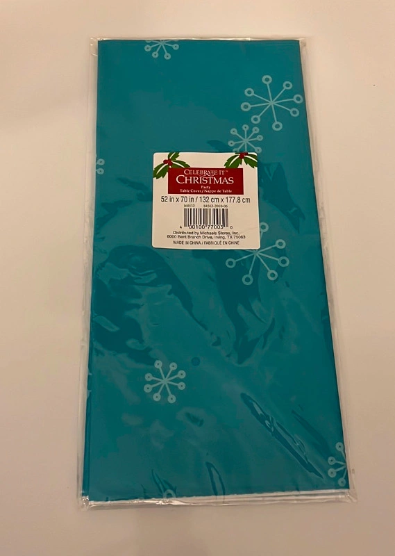 15New in package Christmas tablecloth. Aqua blue with white snowflakes. Plastic. 52x70”. Celebrate It Christmas. $5. Near the Burlington/Oakville border. Cash and cashless payments accepted.