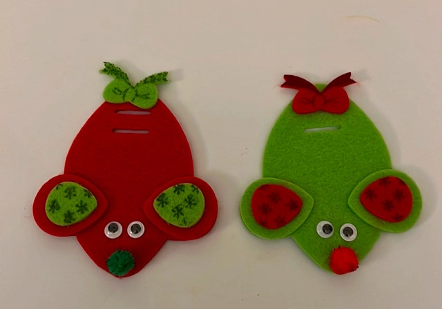 15New handmade Christmas decorations. One red and one green mouse. Each holds a candy cane. Holiday home decor. Priced as a pair. $6. Near the Burlington/Oakville border.