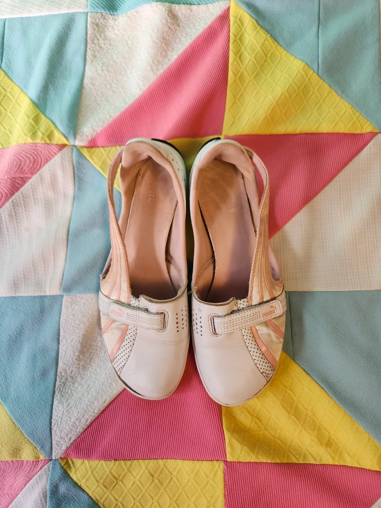 75white and pink Puma flats with adjustable straps the iconic Puma speedcat ballet flats. In need of some serious tlc, see the desc. for more details Label size women's 8 1/2 or european 39 item is okay condition, there is a few noteable flaws. some peeling between the rubber bottom and the shoe at the front, some peeling on the pleather, and some scuffs on the shoes. They are also a little dirty, but if you like I have sneaker cleaner and can wash them before sending, let me know 🫶🏻 please keep this in mind when purchasing!!