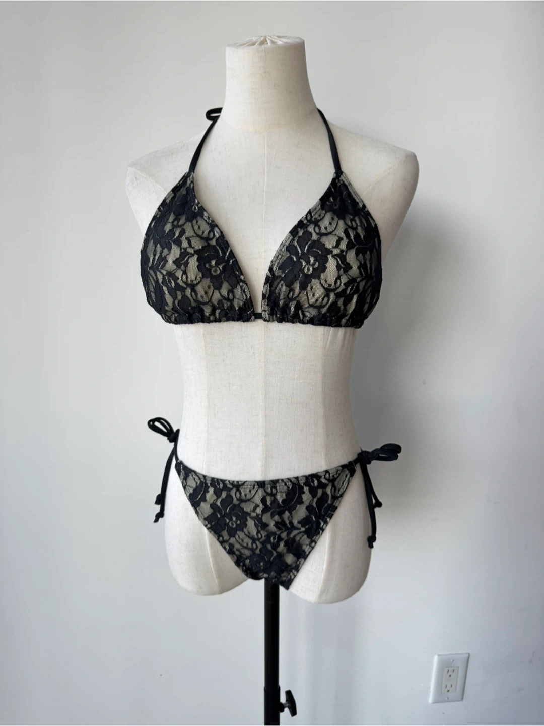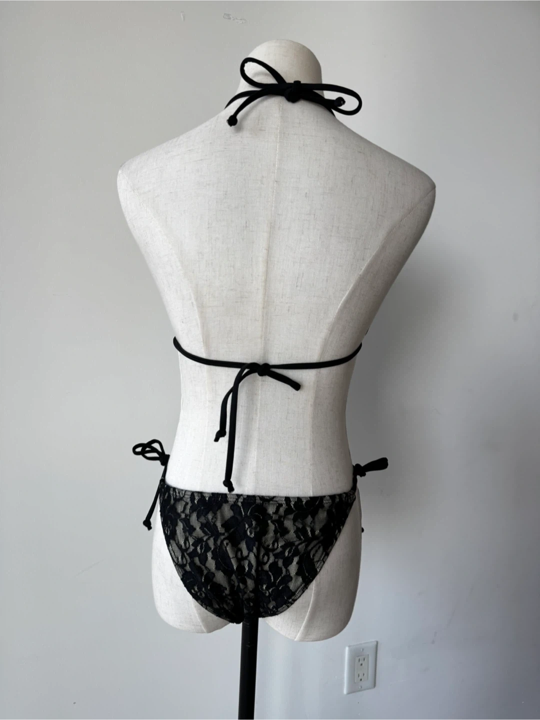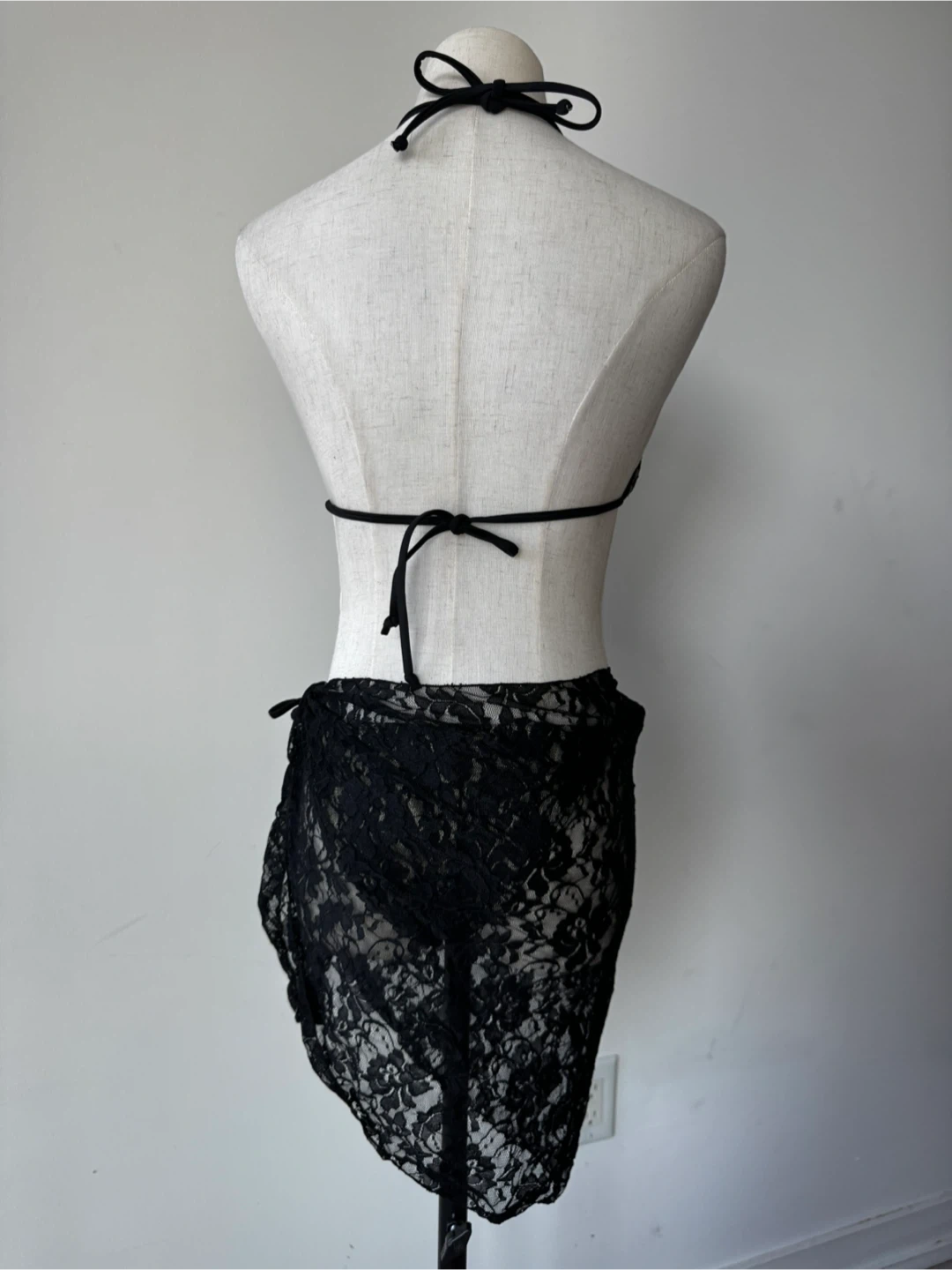 Selling a cute lace bikini set in black! Includes the bikini top, bottoms, and a matching sarong. Perfect for the beach or pool!
