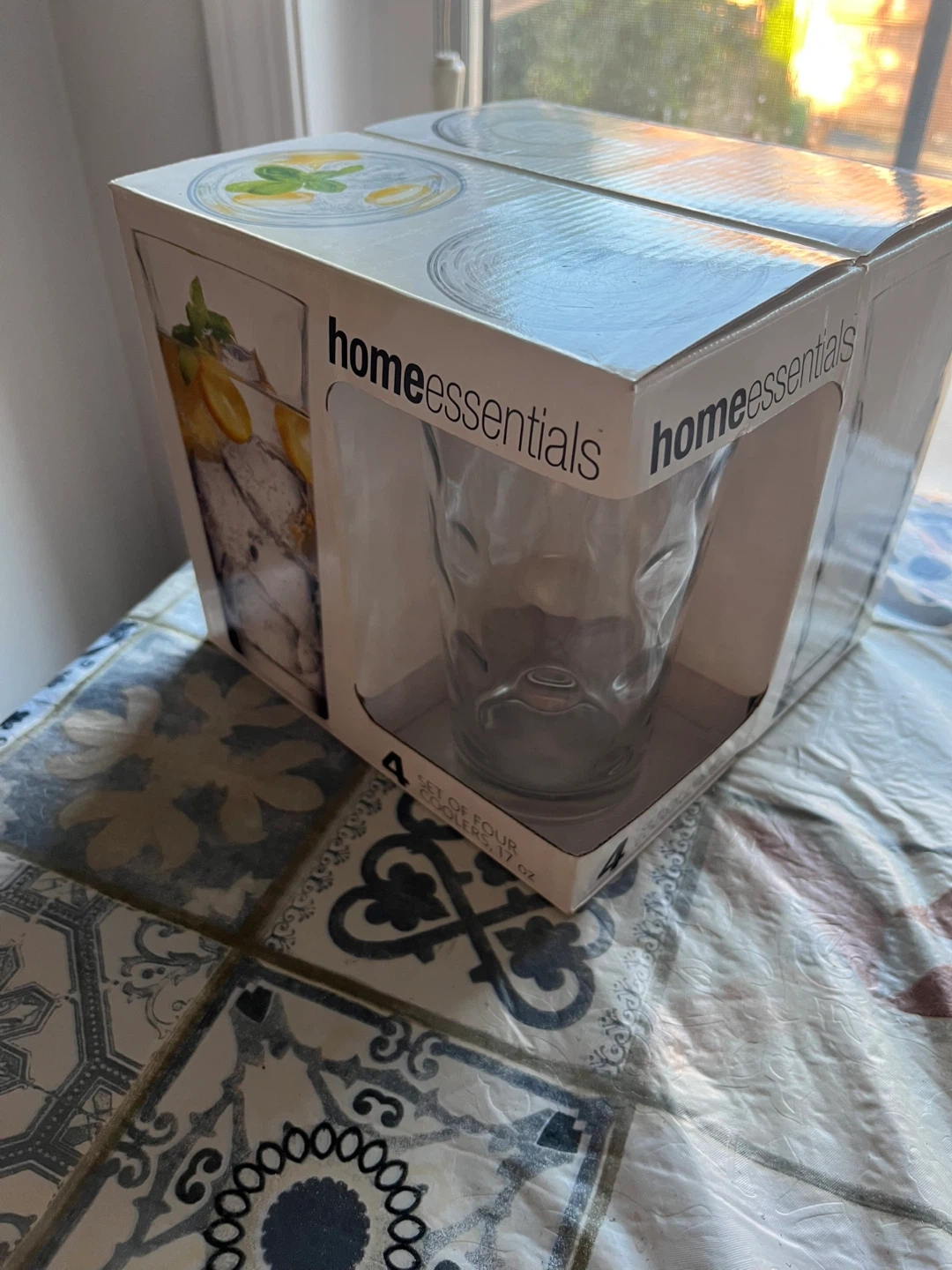Selling a used like new set of four Home Essentials glasses! They are still in the original packaging, so they're perfect as a gift or for your own home. Each glass holds 17 oz.