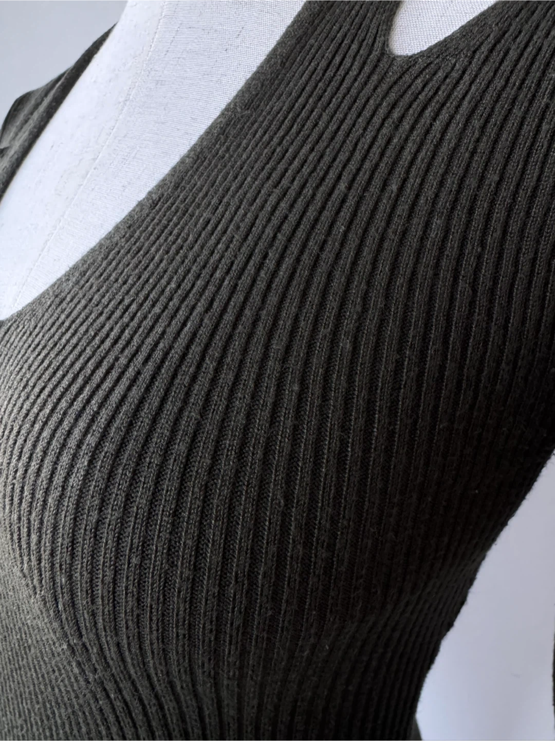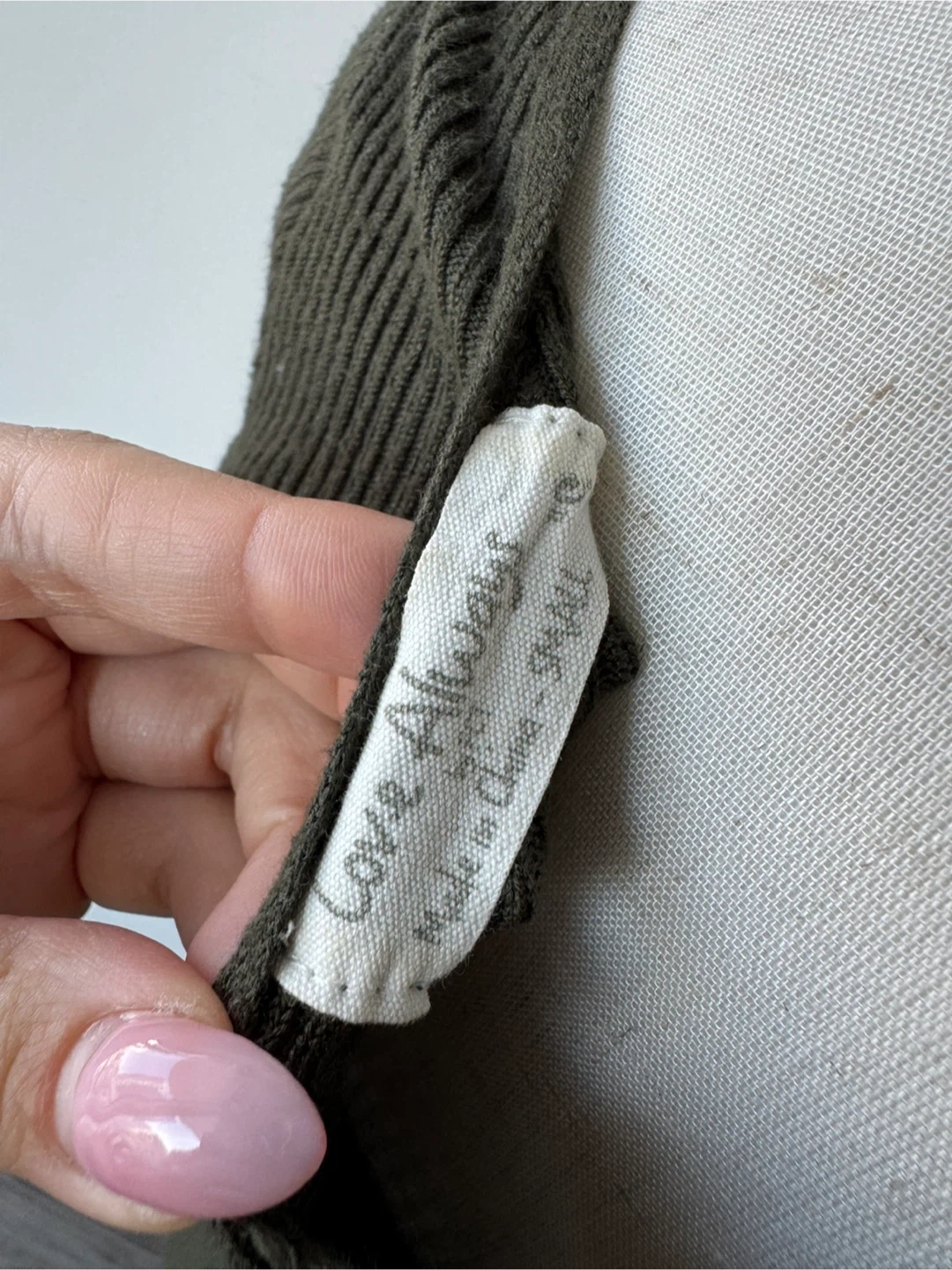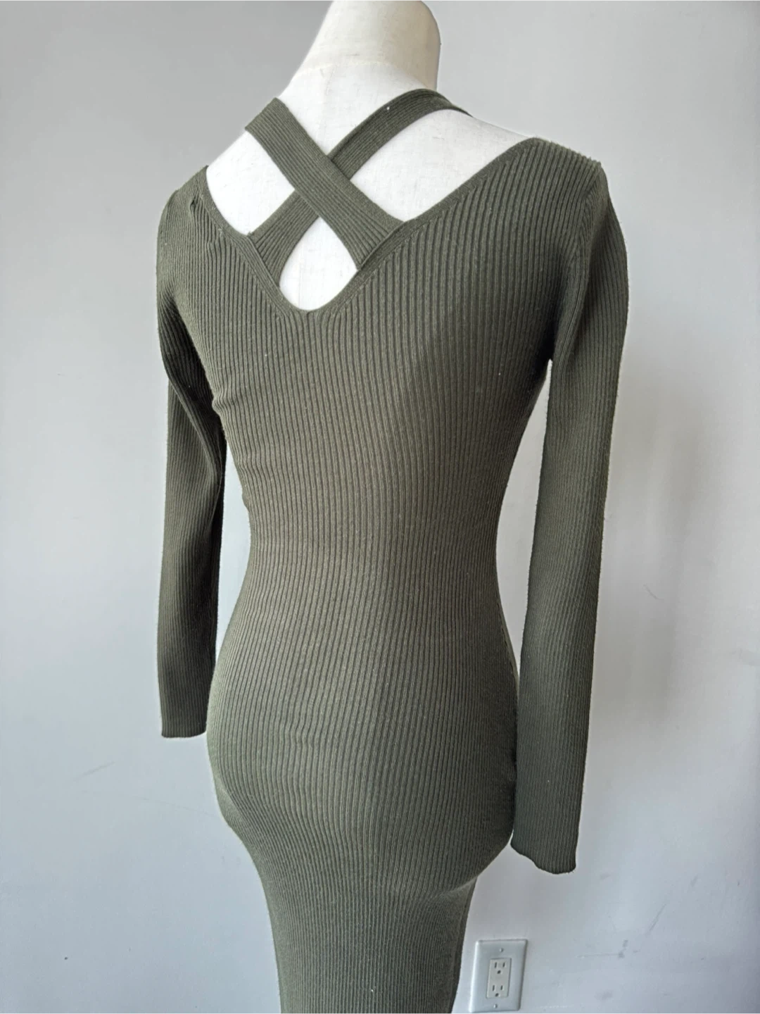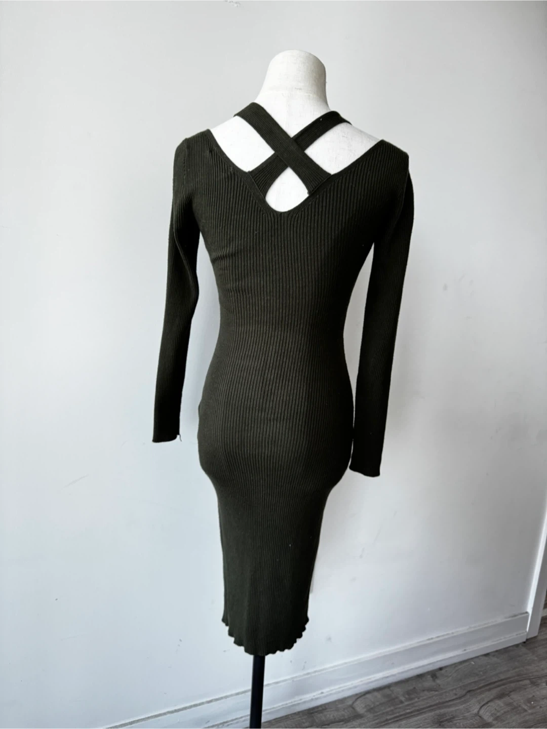 This is a Love Always dress in size small. It's a beautiful olive green colour with a unique criss-cross back design. The material is a comfortable ribbed knit, perfect for any occasion