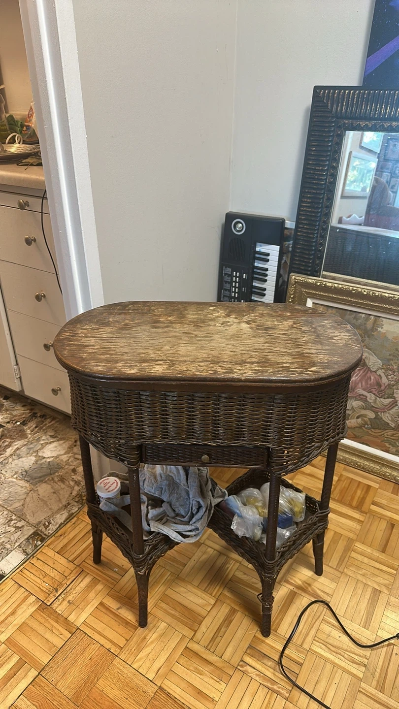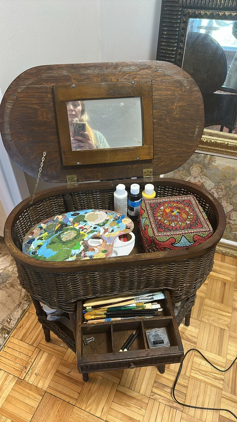 Selling a charming vintage wicker sewing table. It features a lift-up top with a mirror inside, perfect for crafting and sewing projects. There's also a small drawer for storing your essential tools. The table has a lovely, rustic look and would be a great addition to any craft room or living space
