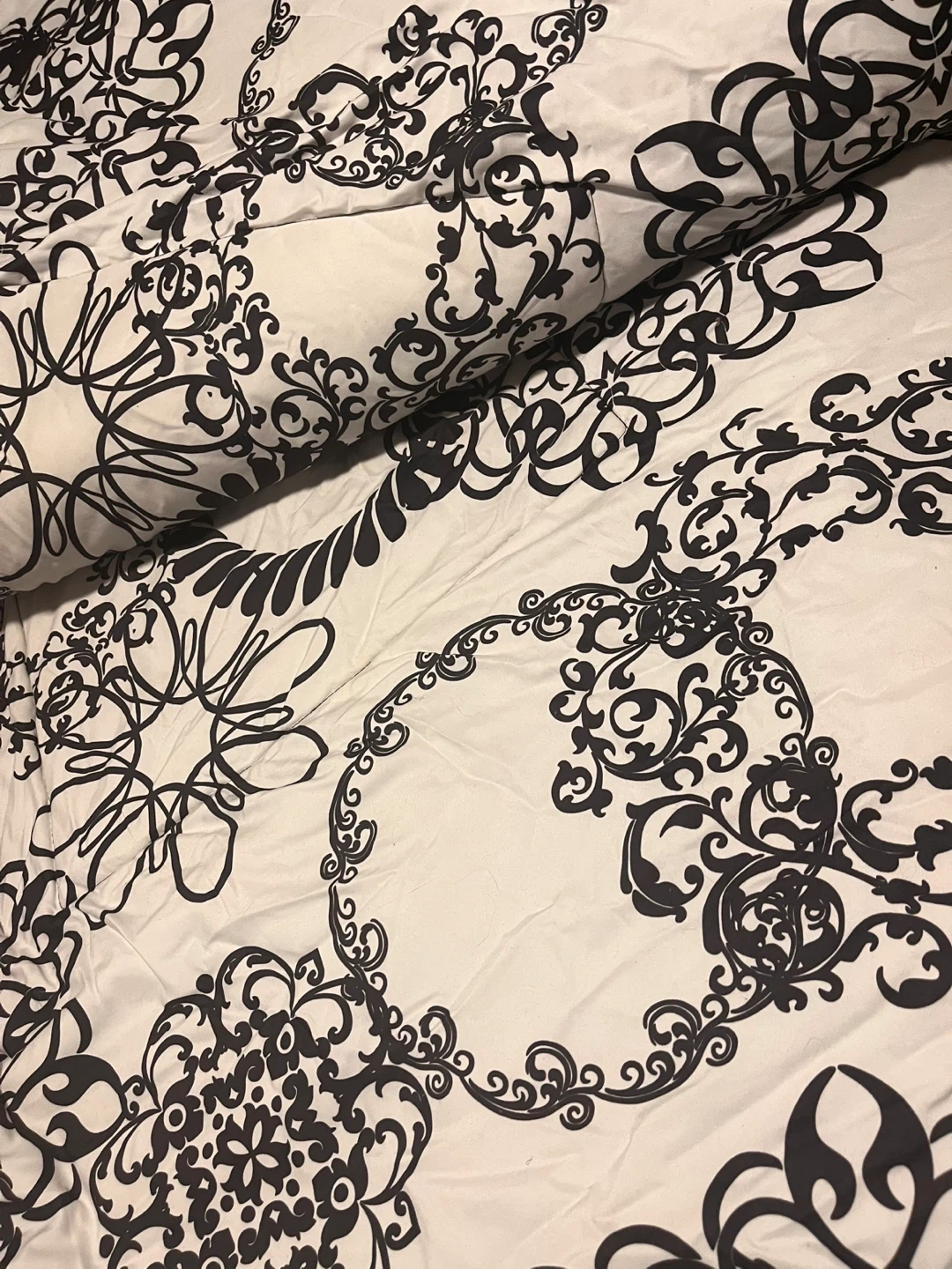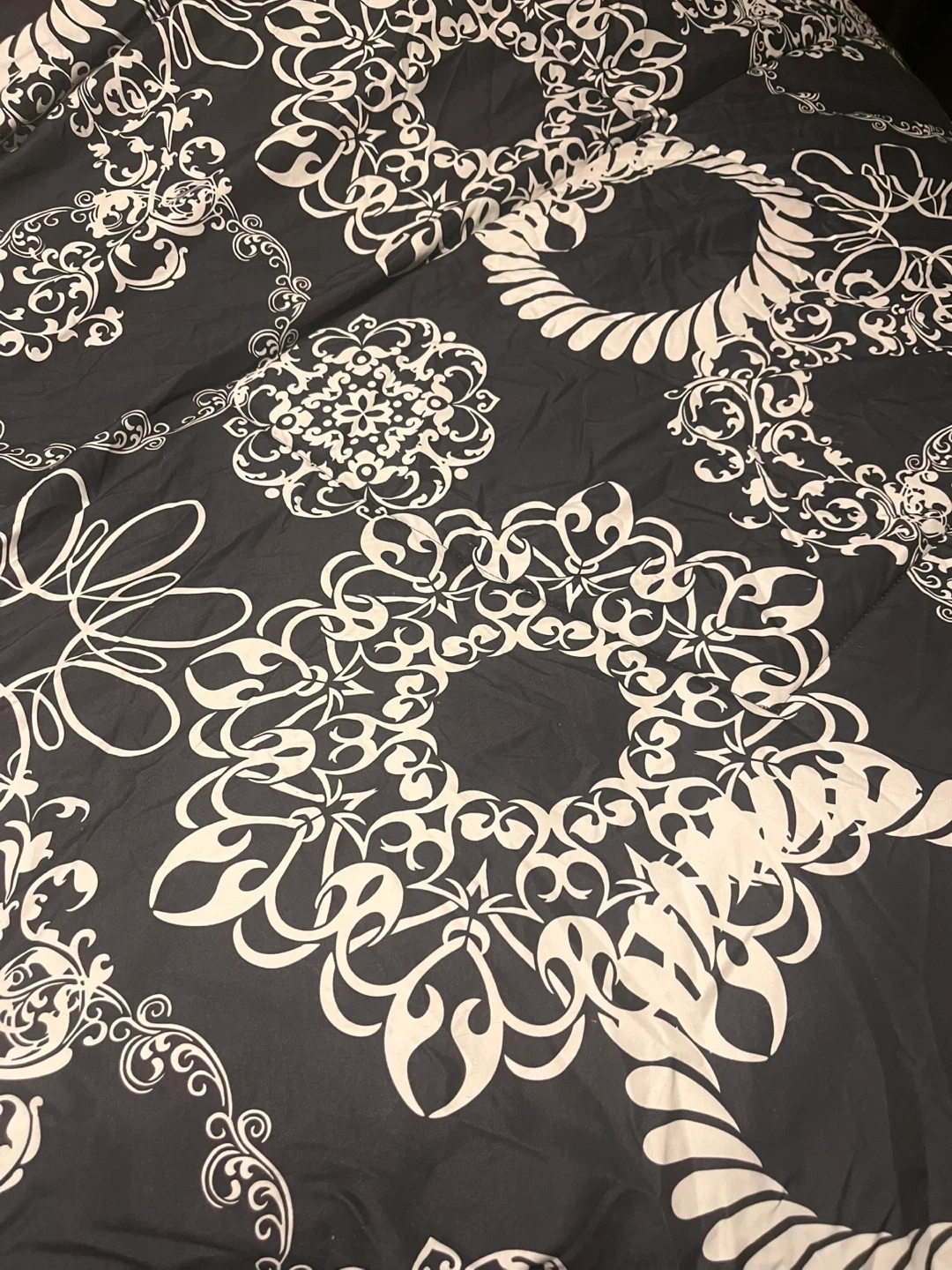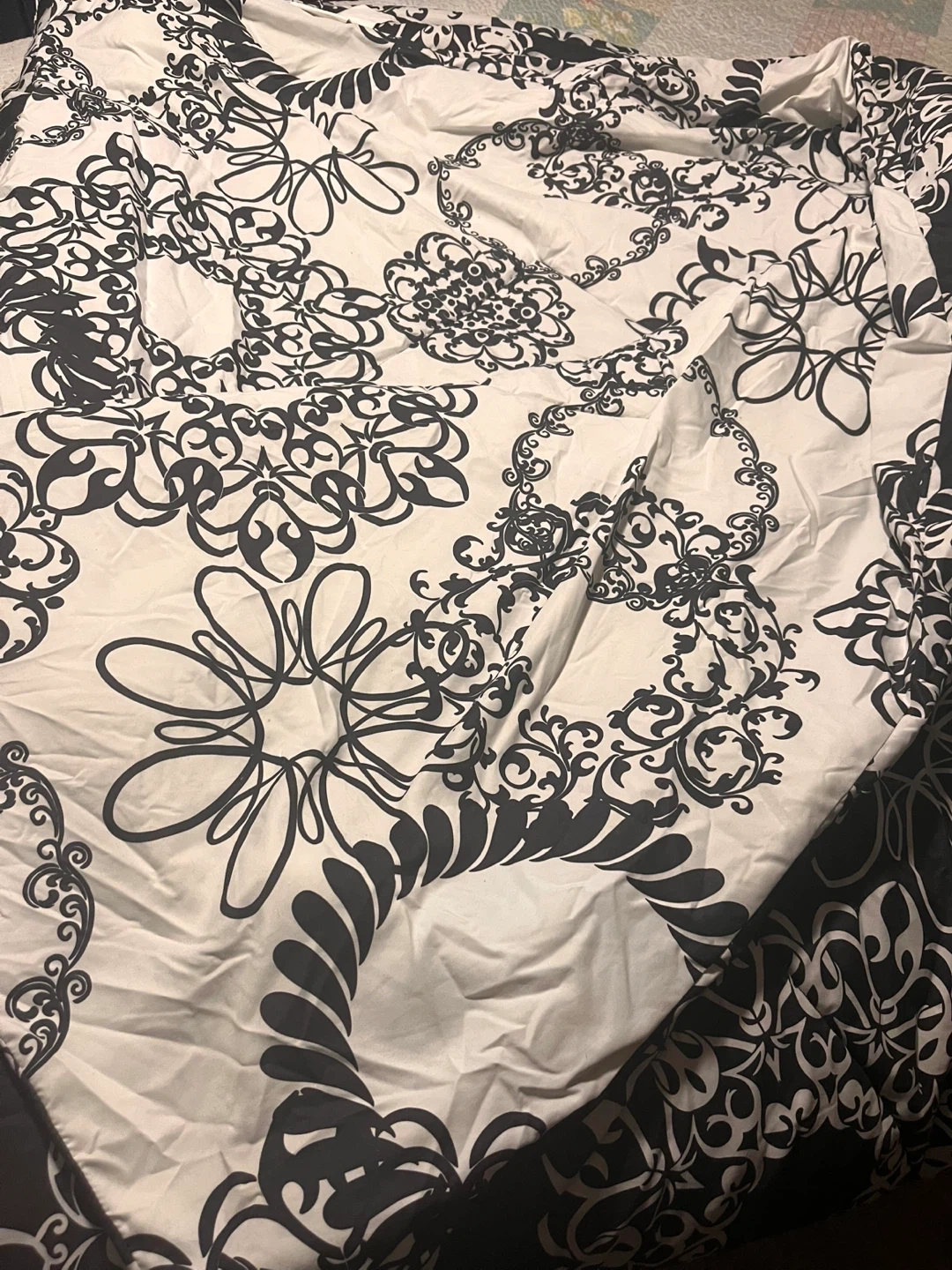 Oversized king size duvet comforter. Never used. Freshly laundered with recent dry cleaning and ready for a new home. The comforter is reversible with lighter and darker sides. Has a beautiful design on both sides.