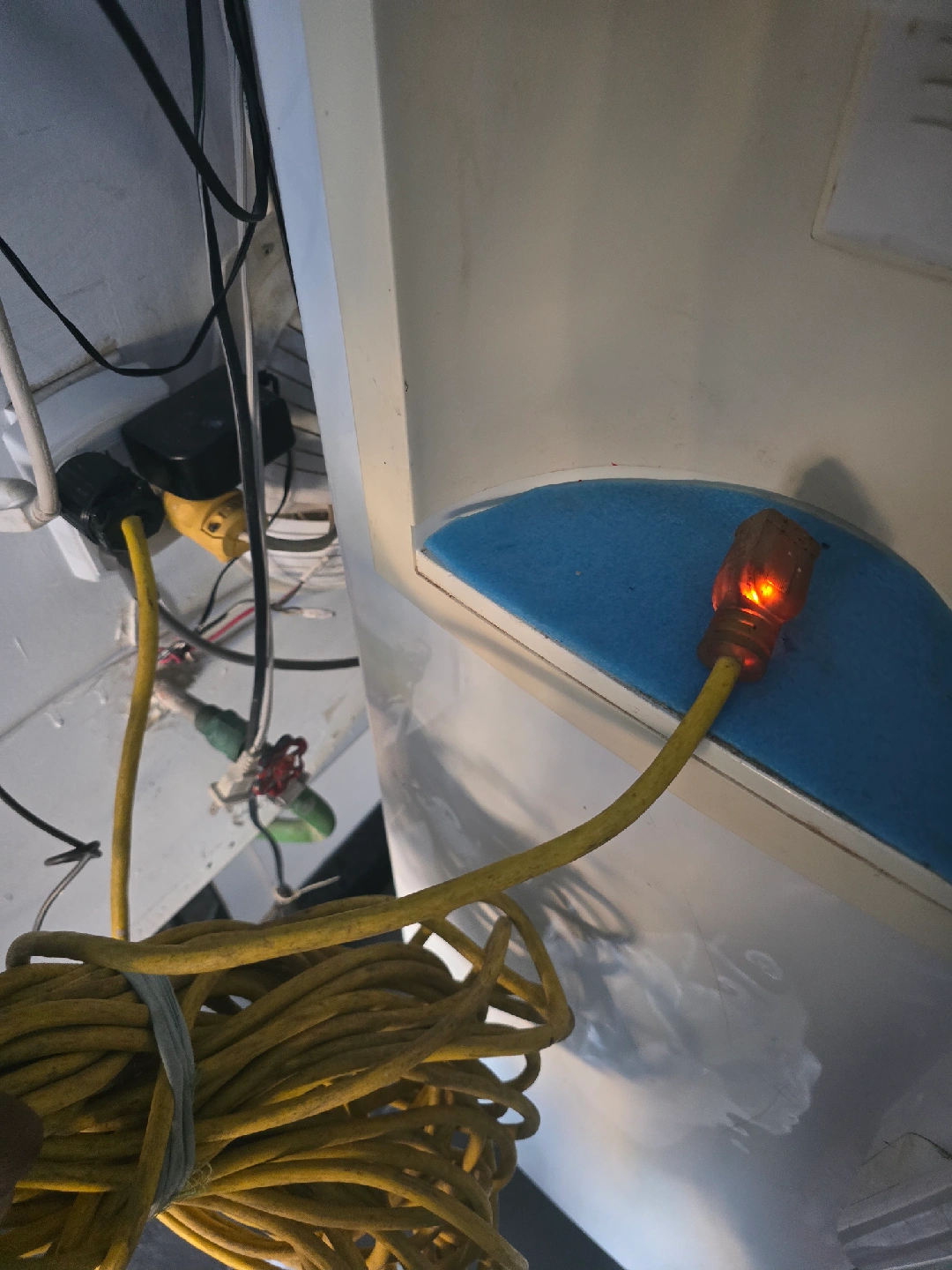 The Yellow ext cable 100-ft. SJTW Lighted End other LKT7515P heavy duty plug. Extension Cord is designed for durability. Rare used not damange. More flexible and abrasion resistant at any temperature than standard vinyl compounds. new 95$ but giving only 50.