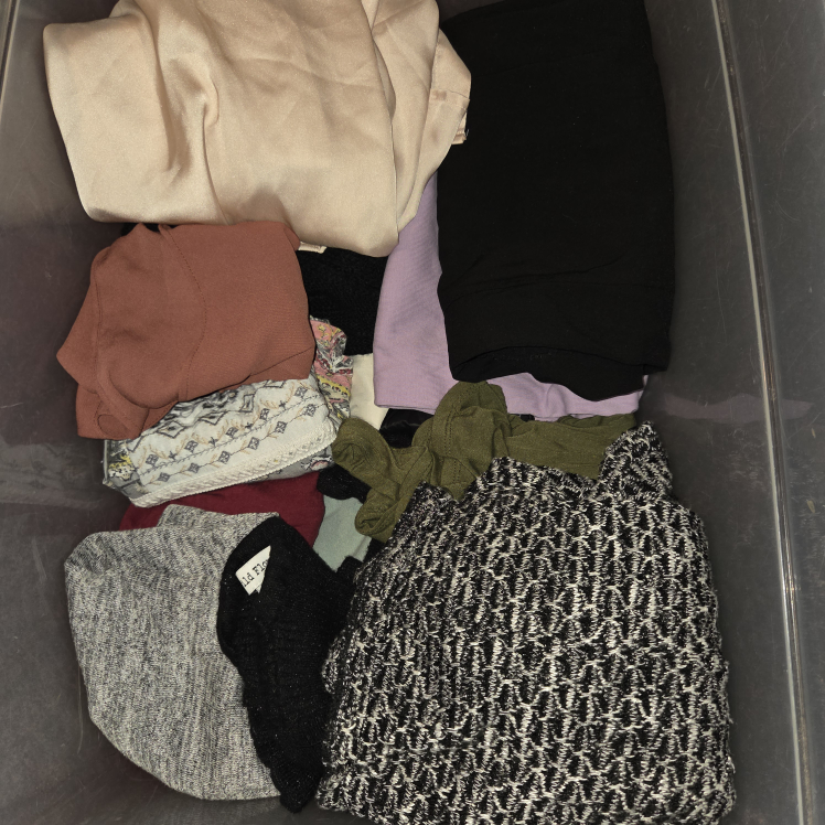 10 tops (cami, tanks, tee, blouse, sweatshirt, and long sleeve, and sweater). Dress pants, black wool scarf, and 2 windbreaker/rain jackets.