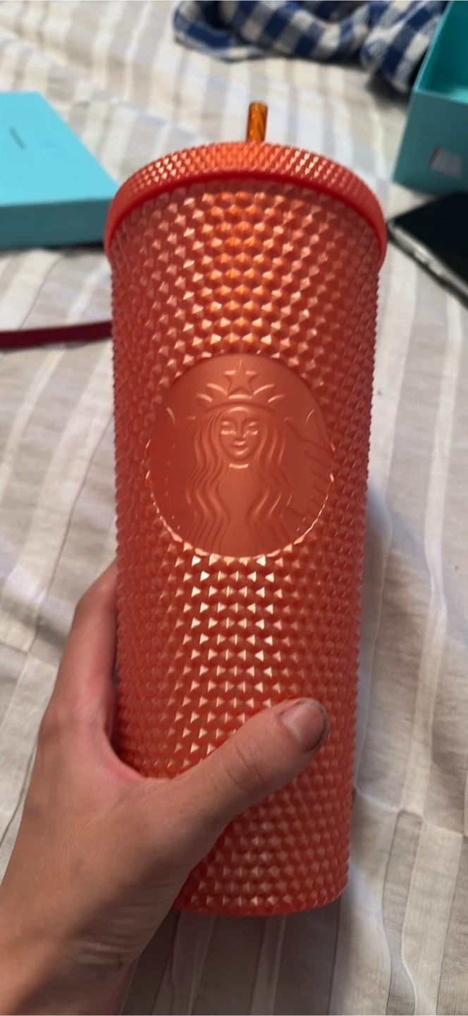 15Selling a Starbucks 24 fl oz orange studded tumbler! It's in great shape and ready for your favourite drinks. Perfect for staying hydrated in style