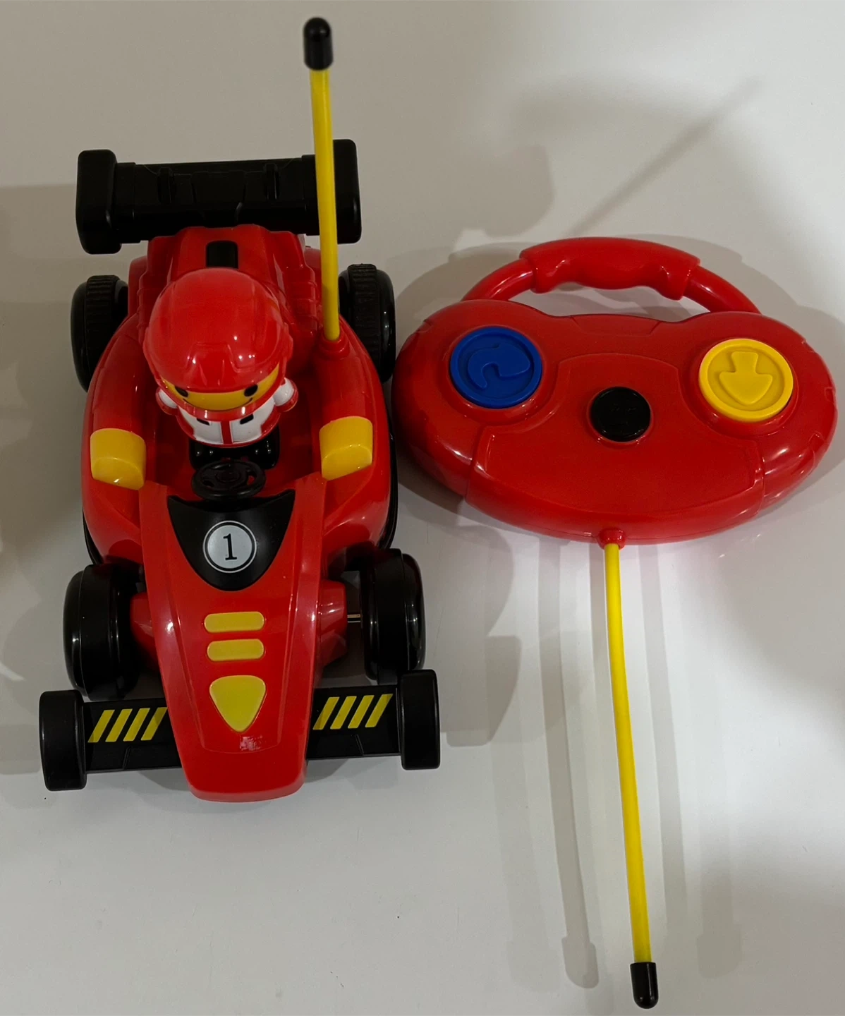 Selling a cute red remote control race car! It comes with a remote that has a yellow and blue button. The car has a race car driver and cool yellow details. Great for kids!