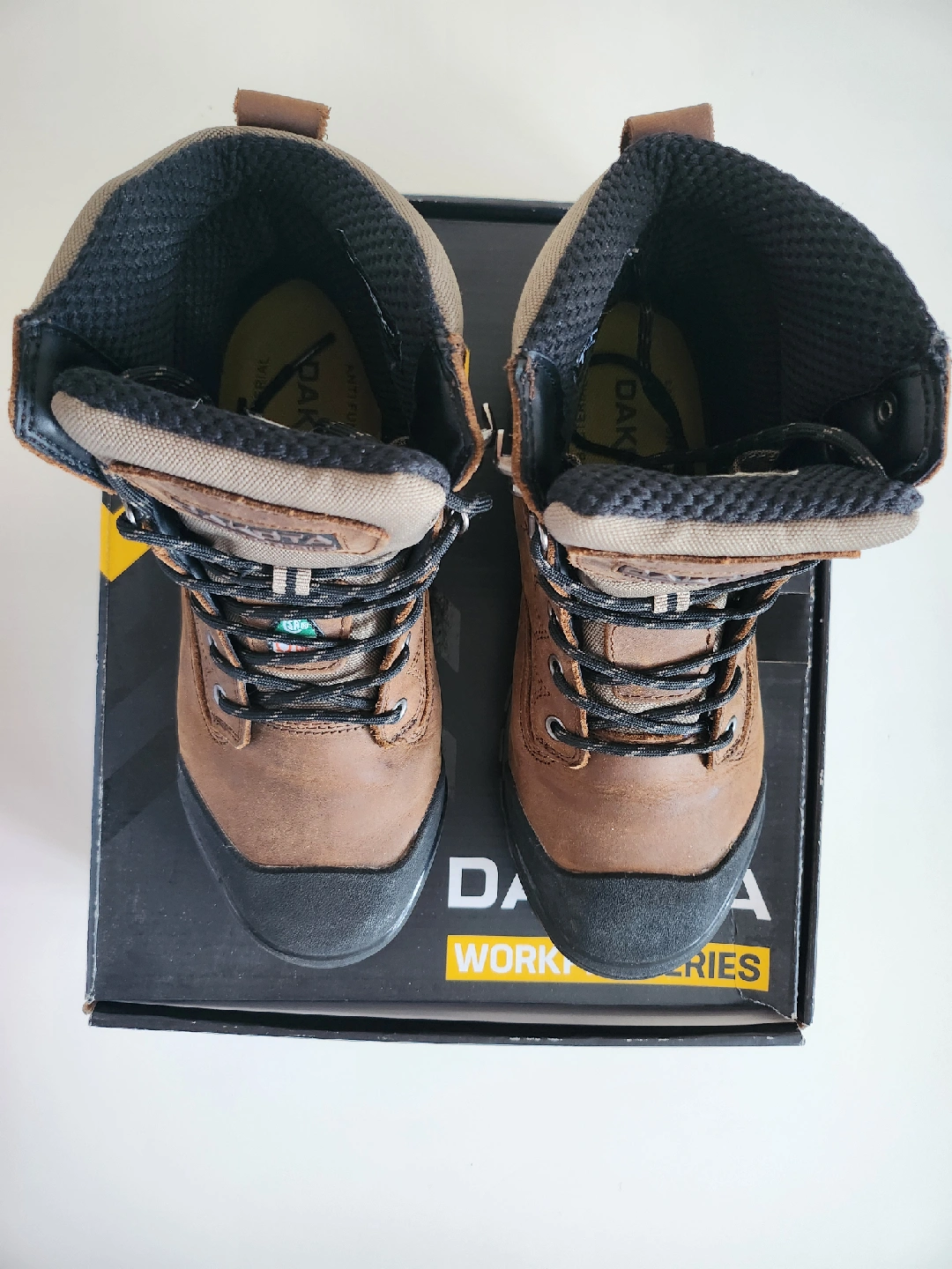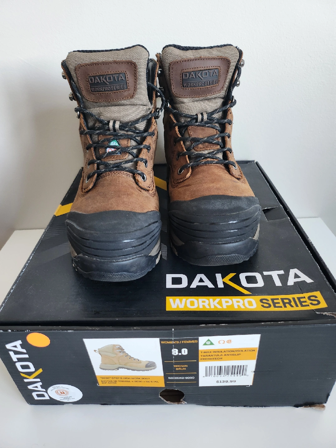 Selling a pair of Dakota Workpro Series women's work boots in brown, size 8. These boots are in great shape and come with the original box. They are designed for comfort and protection on the job. The box indicates they have 1 MAX insulation/insulation Thermamax.
