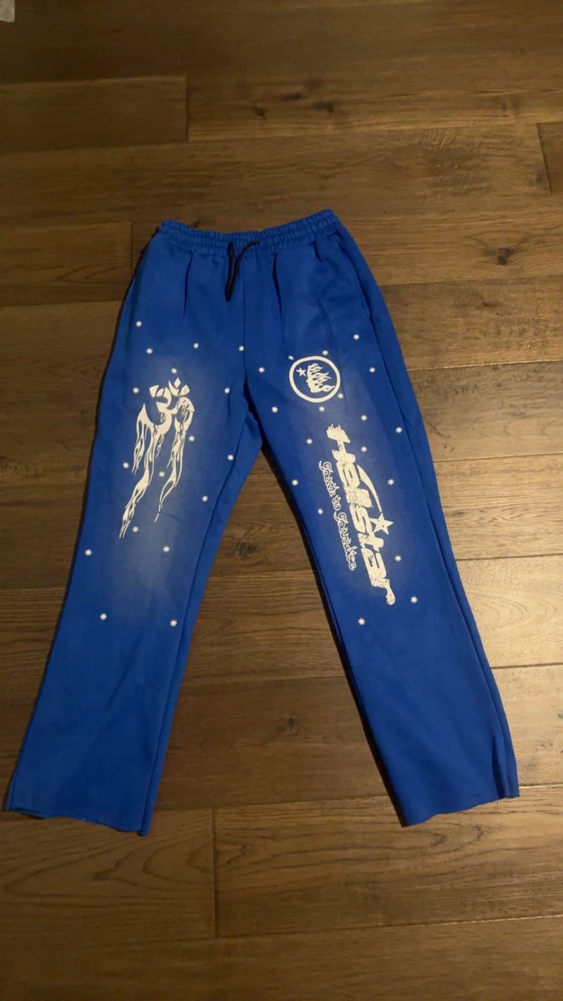 Selling a pair of blue HEISSTAR sweatpants. They have a unique design with white graphics and stars. Perfect for casual wear! size L need gone