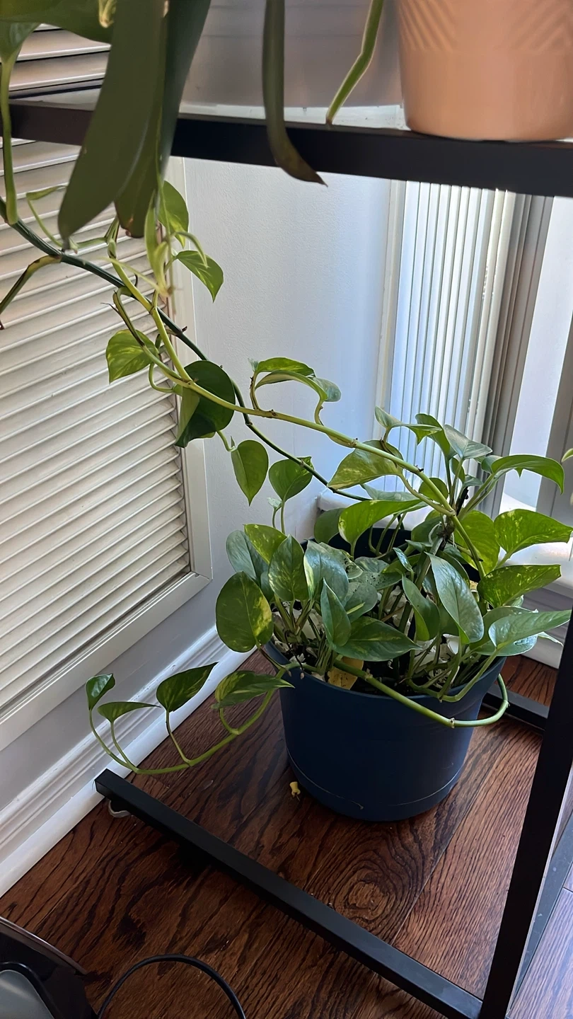 Selling a healthy golden pothos plant in a dark blue pot! It's currently sitting on a black metal plant stand. It would be a great addition to any home or office space