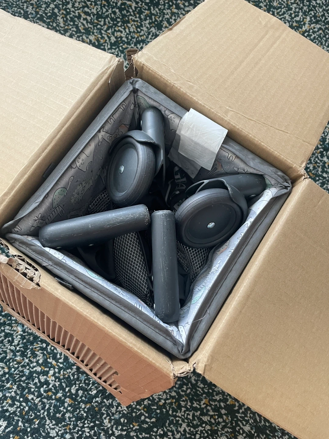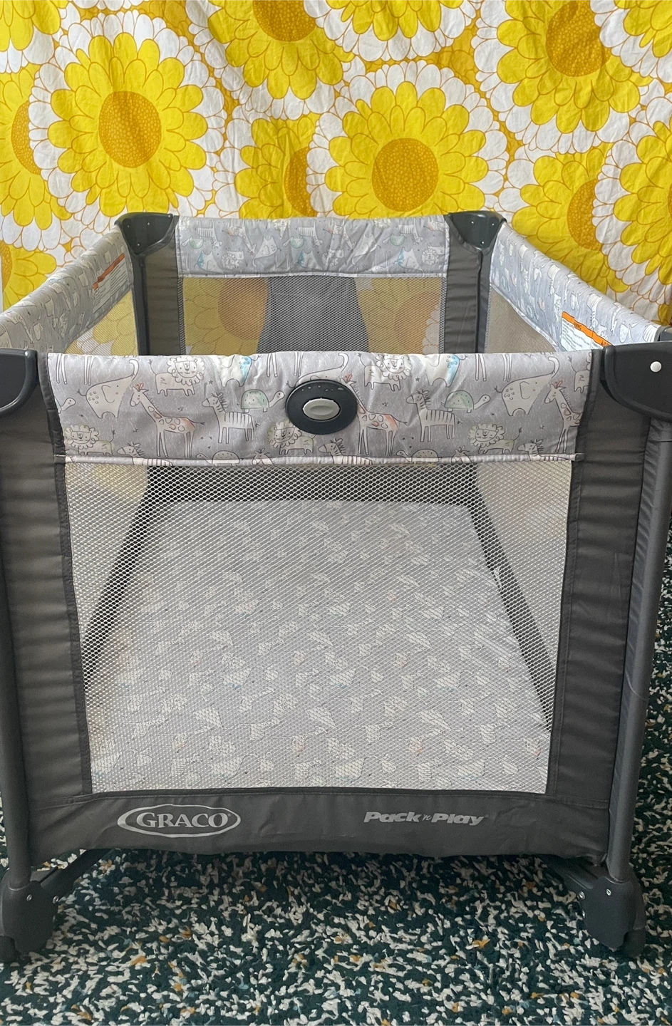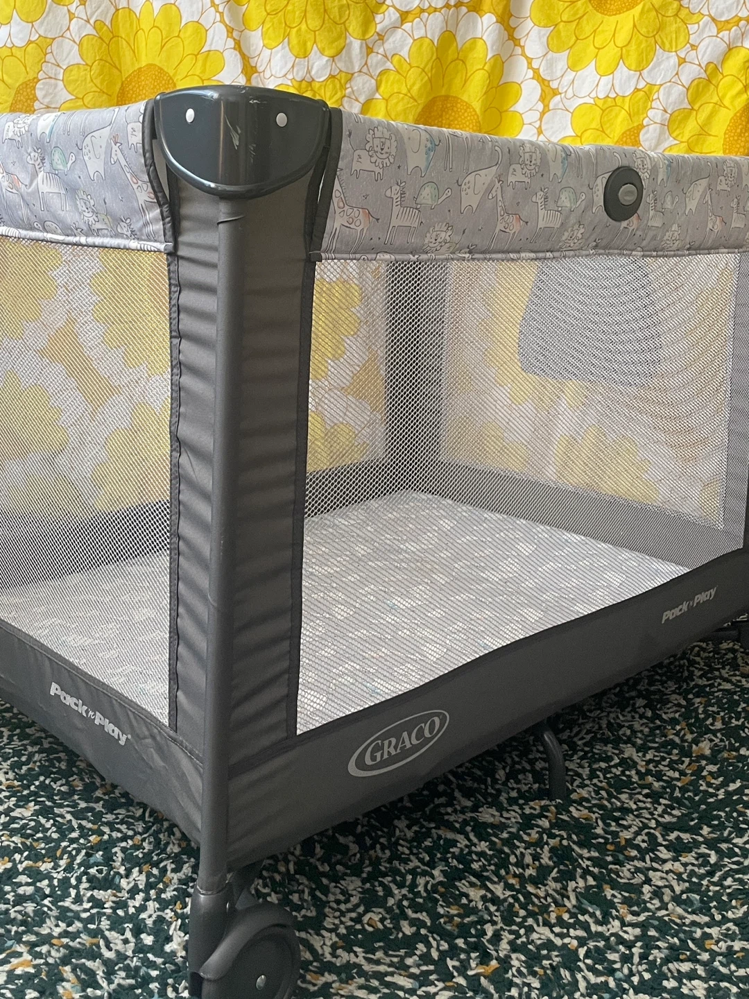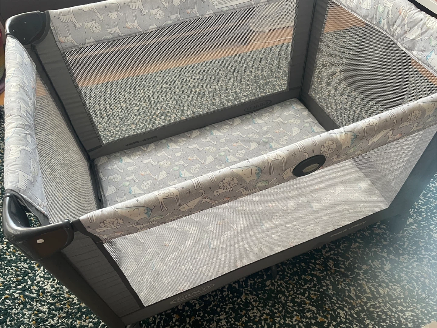 Good condition (small stain on bottom panel, see photos). Otherwise it is as it was when we purchased. It’s always been a bit tricky to get the sides to stick but once it is set up it is solid. Mesh bag on side of crib for storage. Very good size/weight for travel. Approximate measurements: