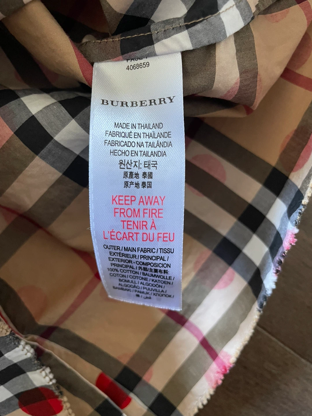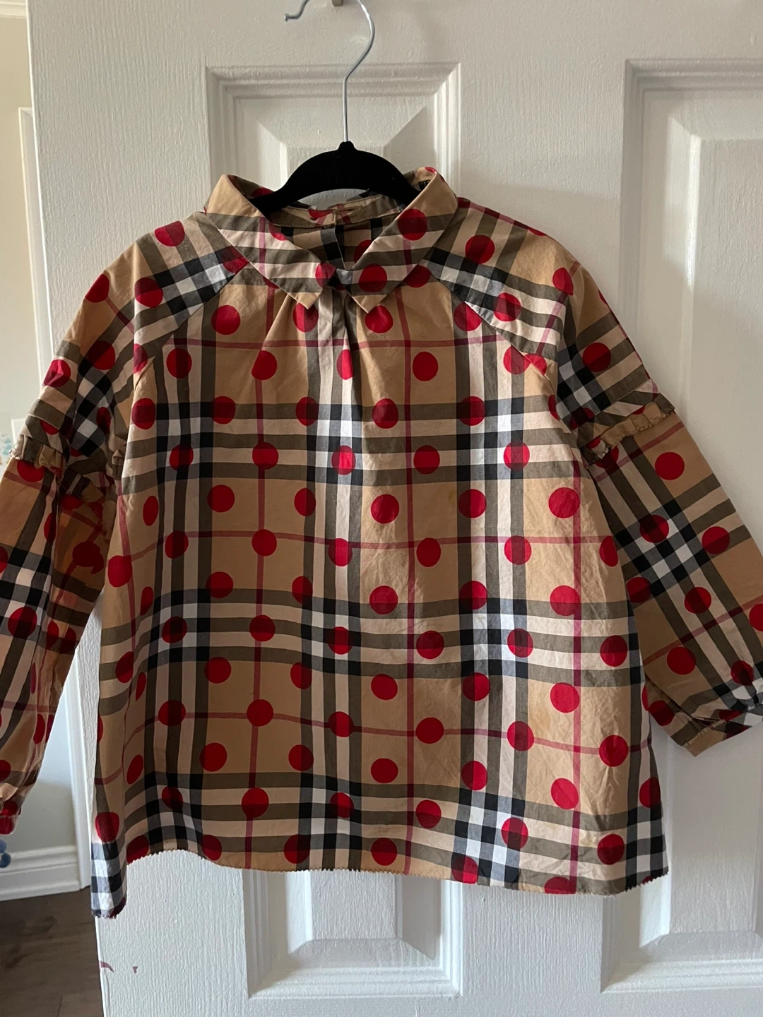 Cute Burberry Children's shirt in size 4Y! It features a classic plaid pattern with red polka dots. The shirt is made of 100% cotton and is in great condition.