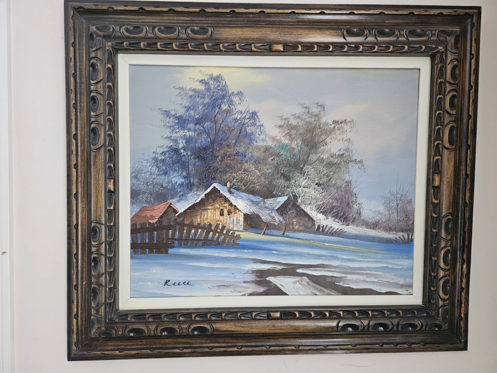 143Beautiful framed painting of a winter landscape scene, perfect for adding a cozy touch to your home decor! The frame has a lovely ornate design
