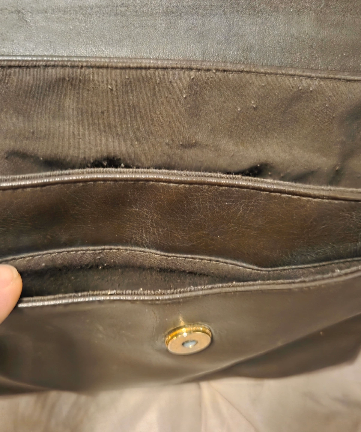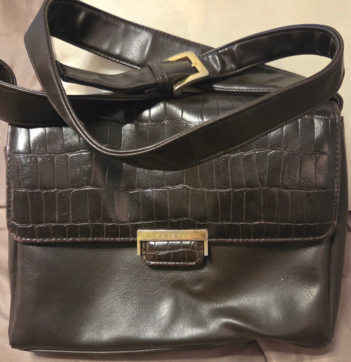 This is a Rosetti shoulder bag in brown vegan leather. It features a croc-like texture on the flap and a gold-tone buckle. It has both a shoulder strap and a shorter handle. The interior has multiple compartments for organizing your belongings