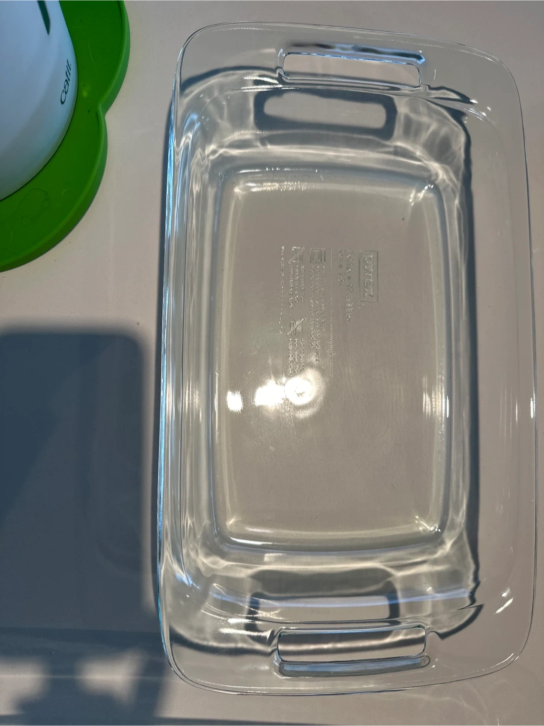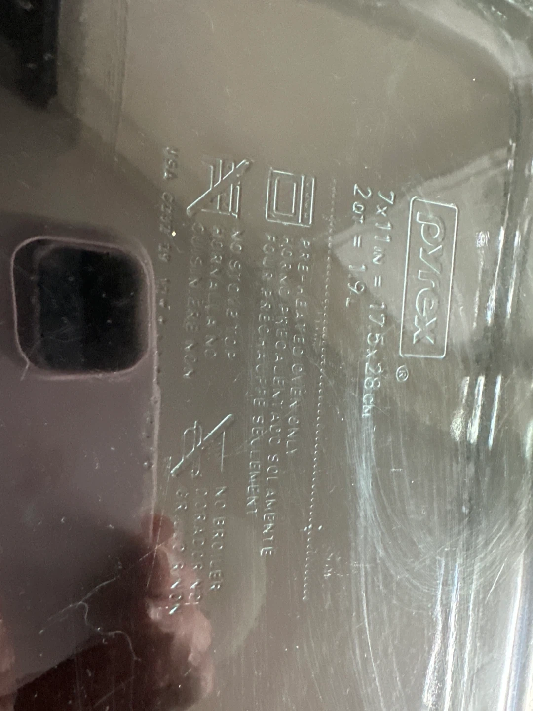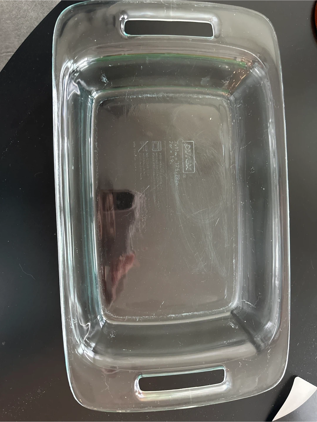 Pyrex baking dish, perfect for making casseroles or desserts! It's a 7x11 inch dish, which is about 17.5 x 28 cm. It holds approximately 2 quarts, or 1.9 litres. It's in great shape and ready for your next baking project