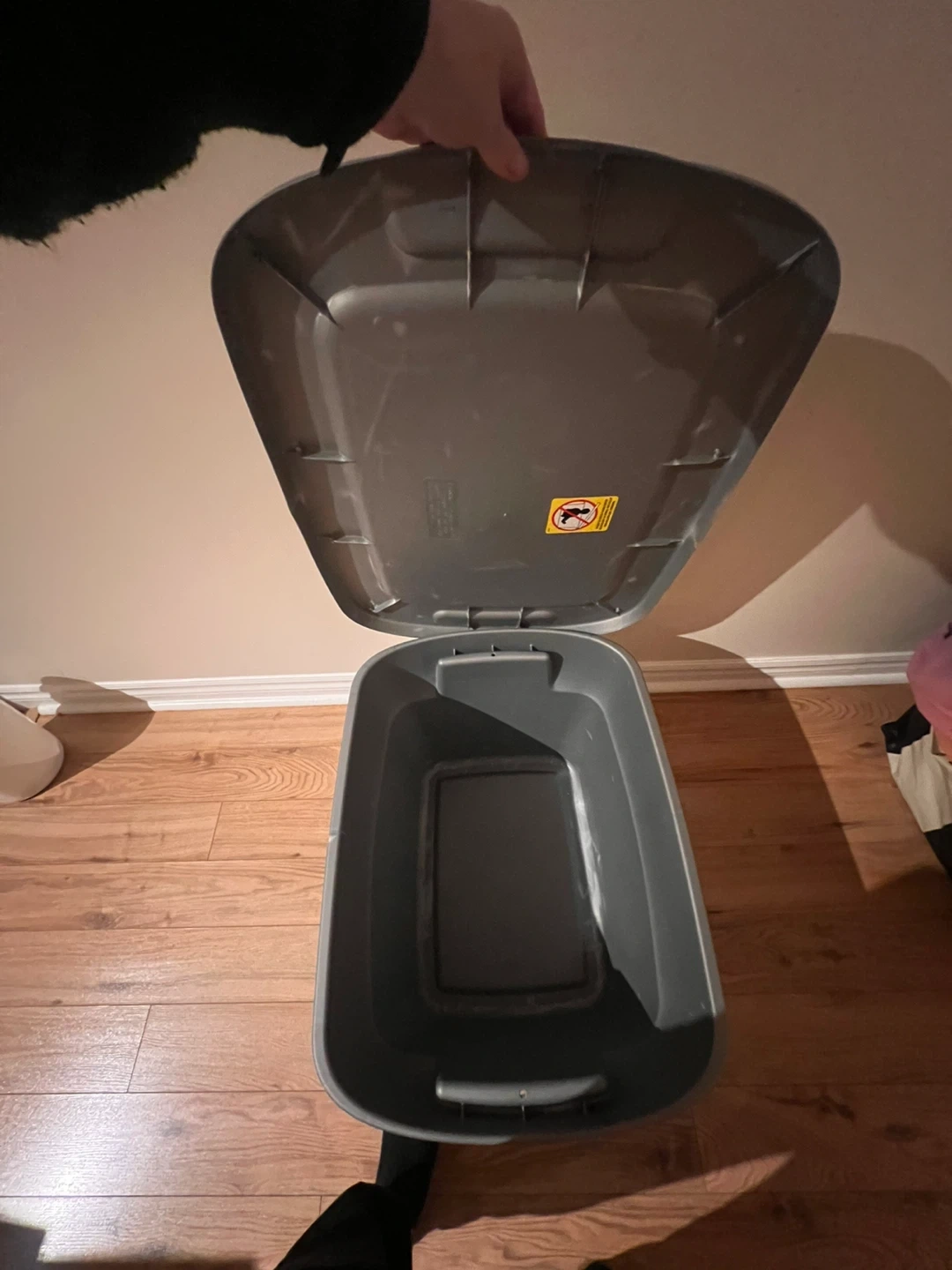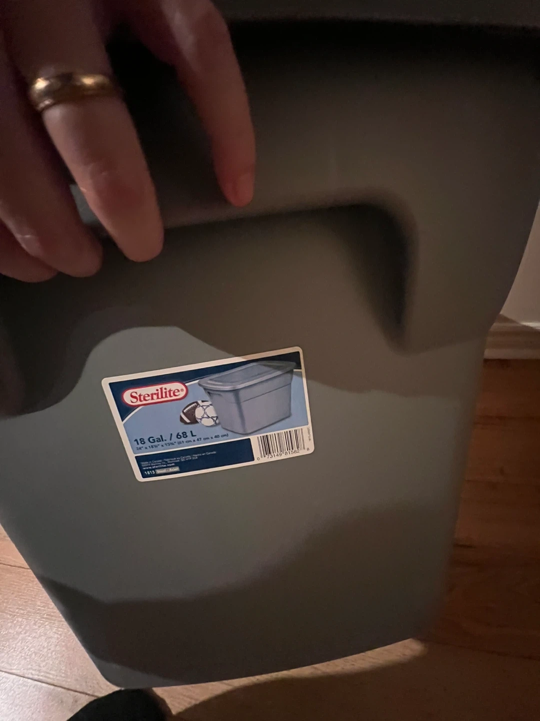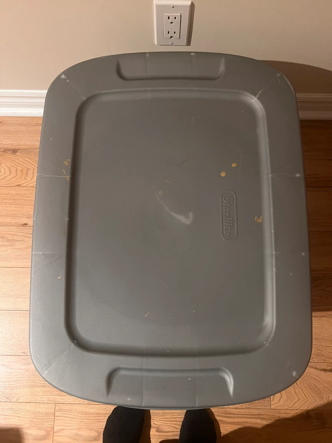 Selling a Sterilite storage box, perfect for organizing your space! It's an 18-gallon or 68-litre size, offering plenty of room for your belongings. The box is grey and comes with a lid. Great for storing various items around the house!