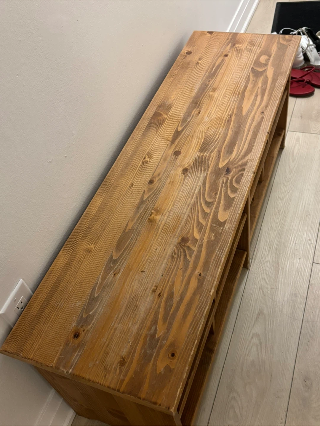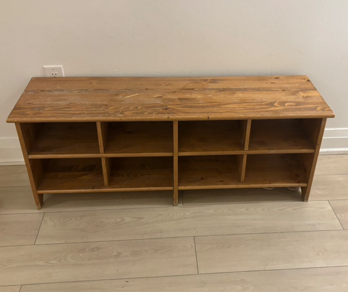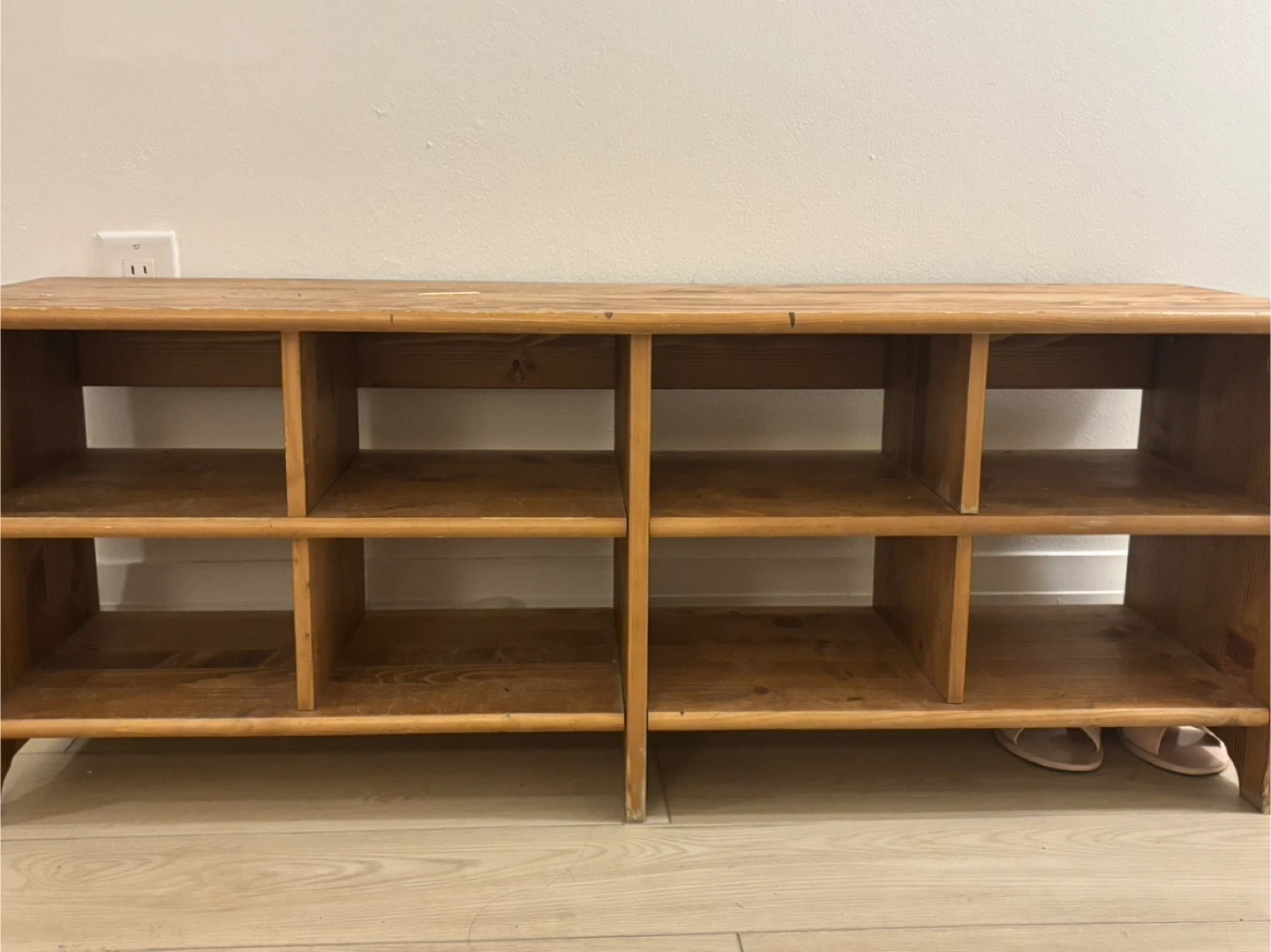 This charming, rustic wood storage bench is perfect for organizing your entryway, mudroom, or closet. It features eight open cubbies that are great for storing shoes, books, or baskets. While it isn't new, it is in good, sturdy condition and has a beautiful, natural wood grain finish that adds warmth to any space. It's an excellent deal at just $30! Pick up only.