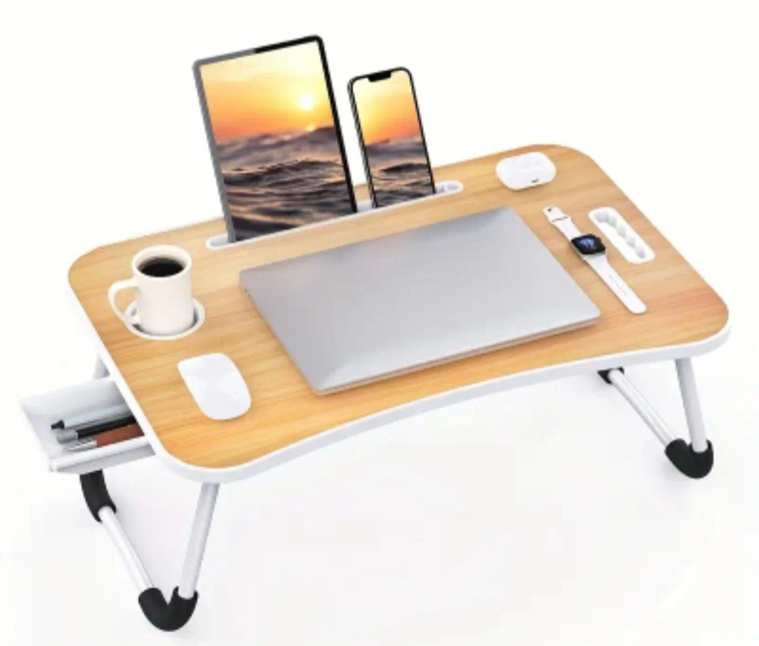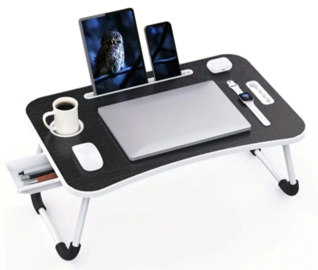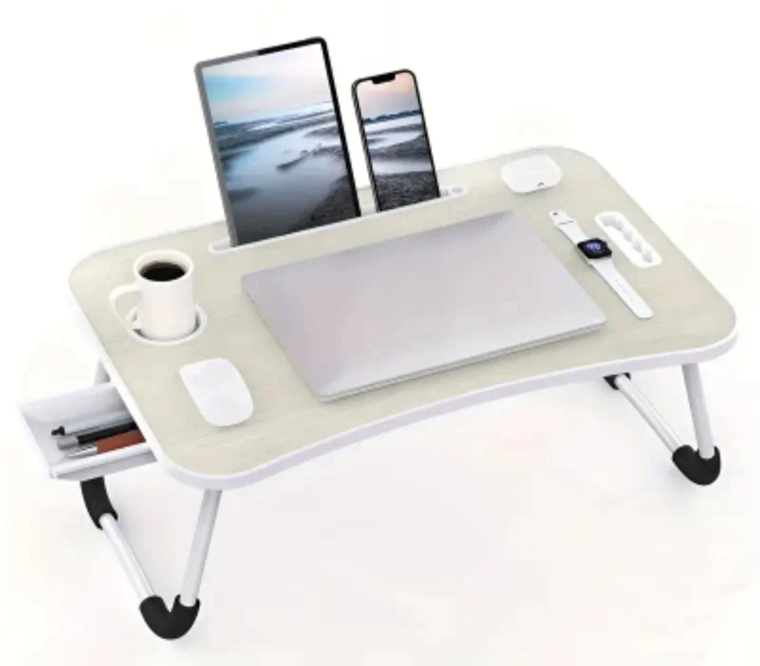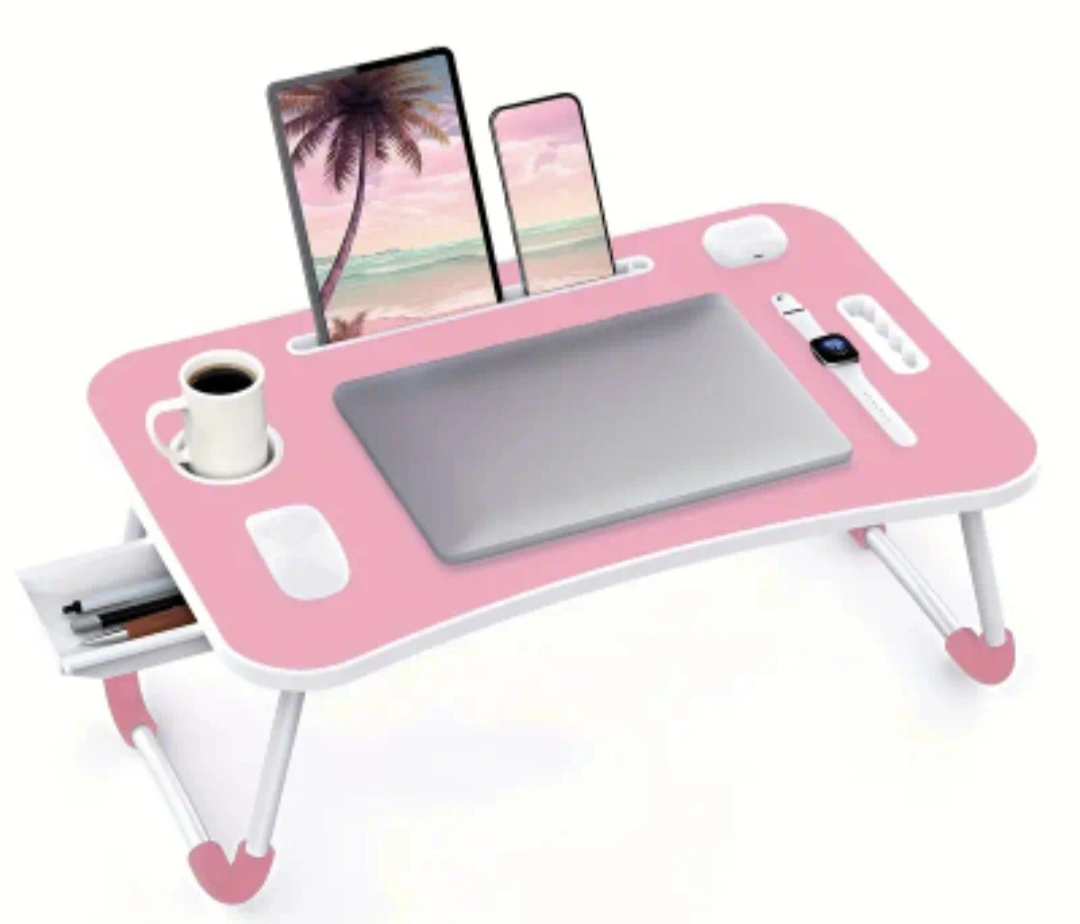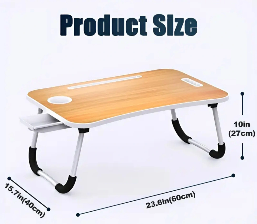 Looking to sell this portable laptop bed desk table with different colors. It's perfect for working or relaxing in bed or on the couch. It features a built-in cup holder, tablet and phone slot, and a small drawer for storing pens and other small items. Dimensions: - Length: 23.6 inches (60 cm) - Width: 15.7 inches (40 cm) - Height: 10 inches (27 cm) Available in black, beige, pink, and wood grain colours