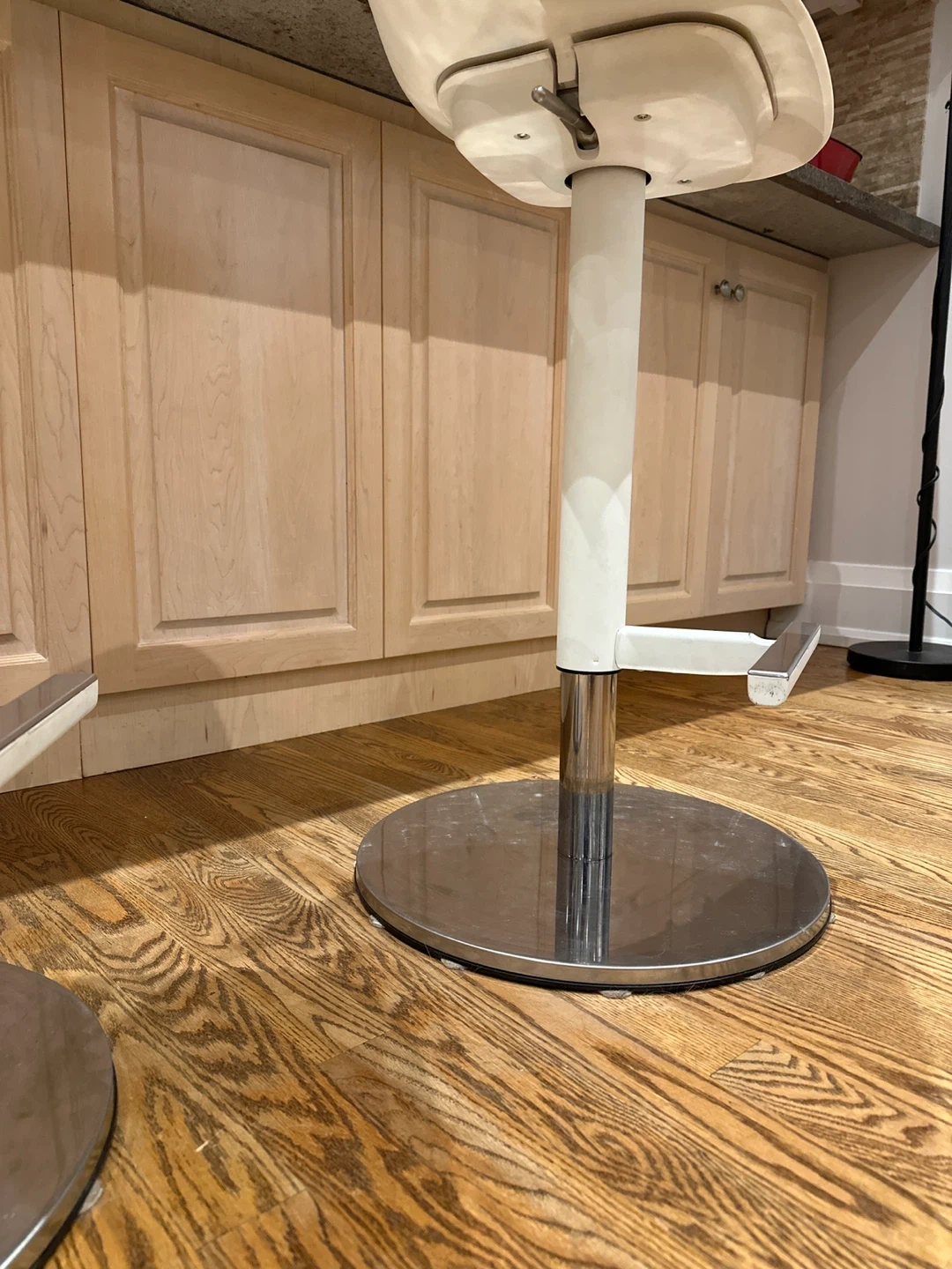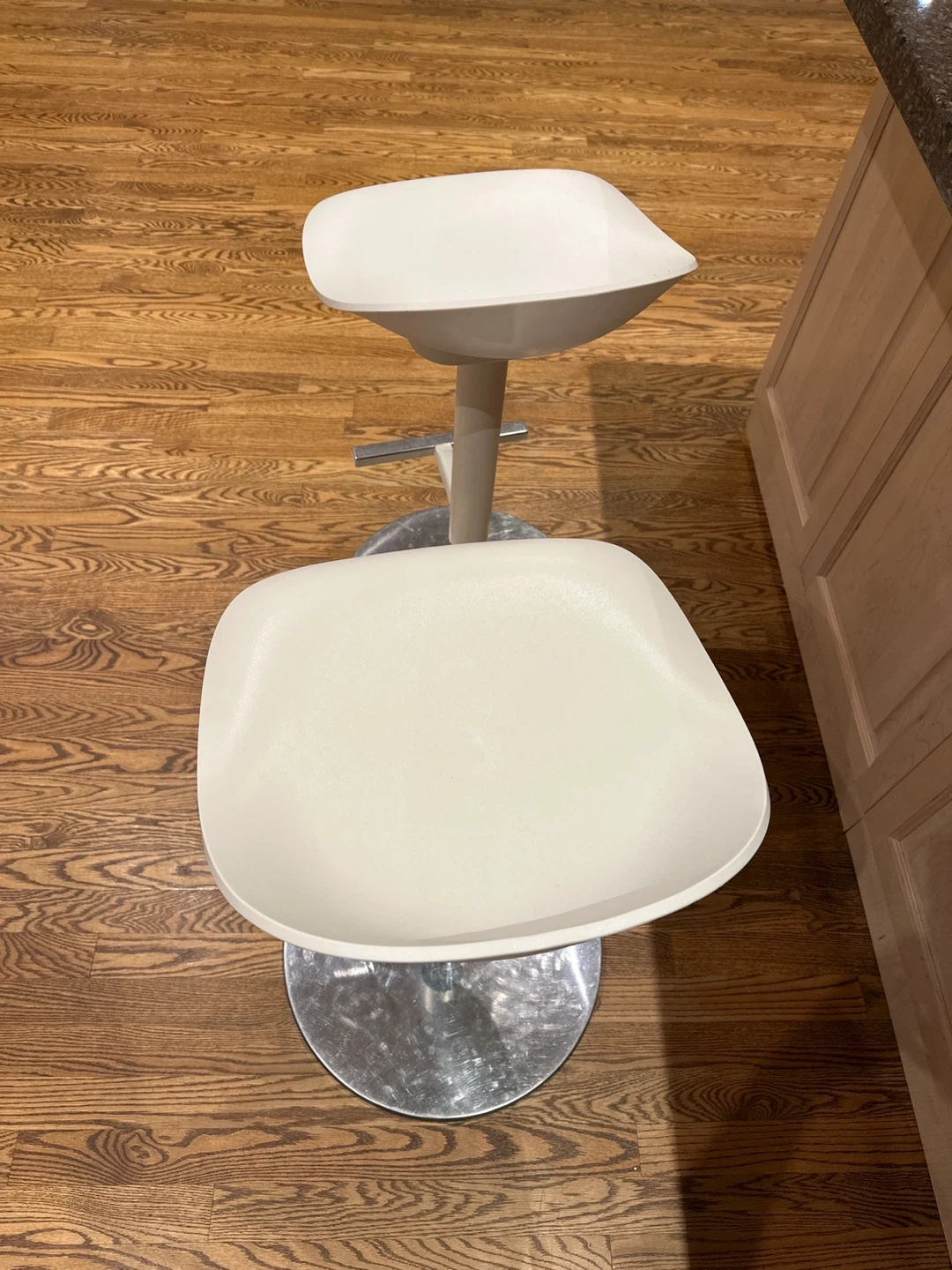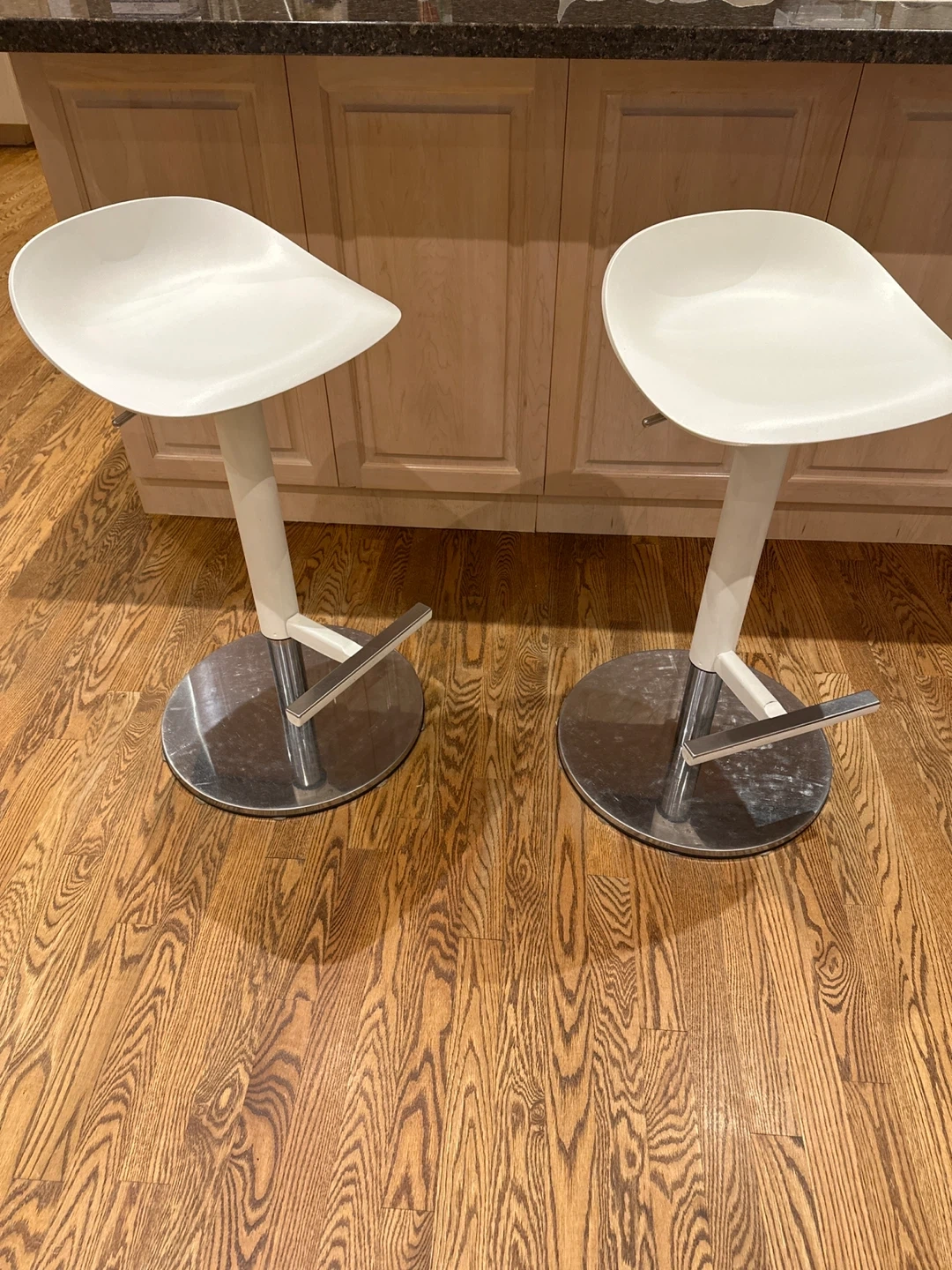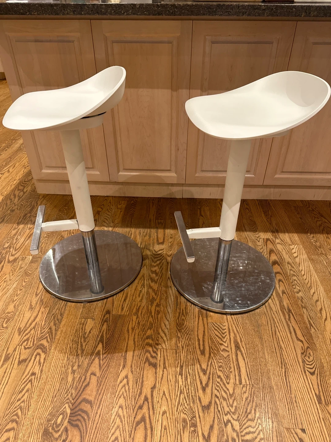 Selling a set of two modern bar stools! They feature a sleek white seat and a chrome base. Perfect for adding a touch of contemporary style to your kitchen or bar area. They're in good condition and ready for a new home