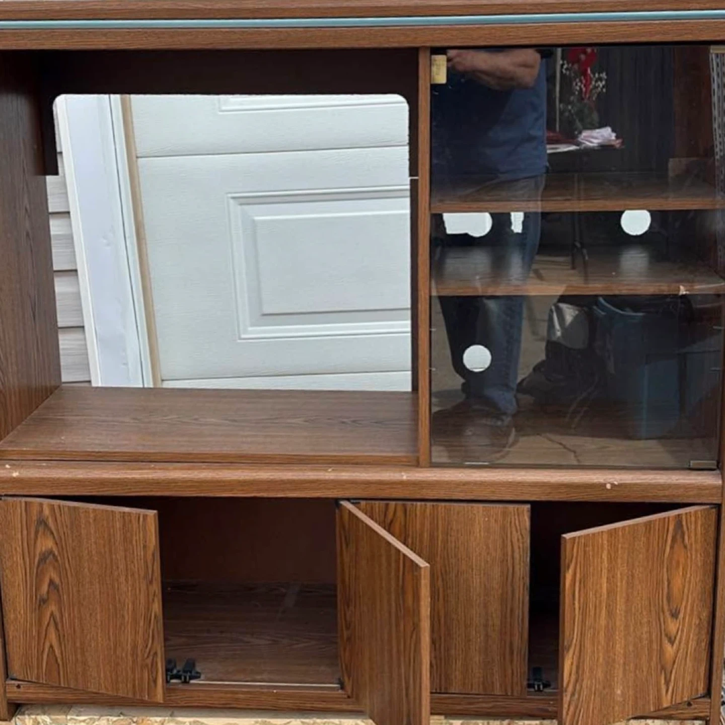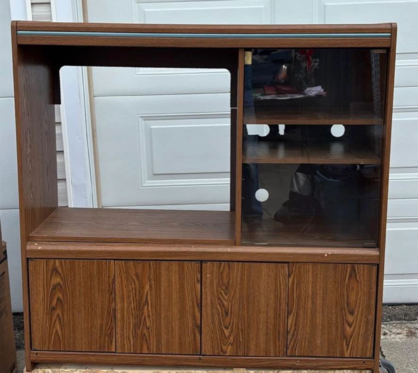 FREE brown wood TV stand or entertainment unit. It has a cabinet with doors at the bottom, a shelf in the middle, and a glass-door cabinet on the right side. Perfect for organizing your media or whatever else you may use it for. Good condition looking for a new home. Measures 46” high and 47” long. Bring your pick up truck and take it home. FREE of charge!! Located in west Edmonton