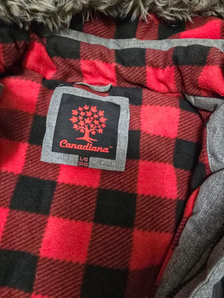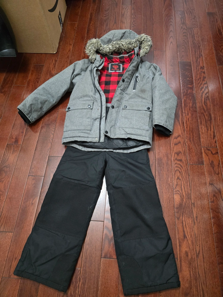 38Selling a Canadiana snowsuit for kids. It's a size L (10-12). The jacket is grey with a faux fur hood and a red and black plaid lining. The snow pants are black and come with adjustable suspenders!
