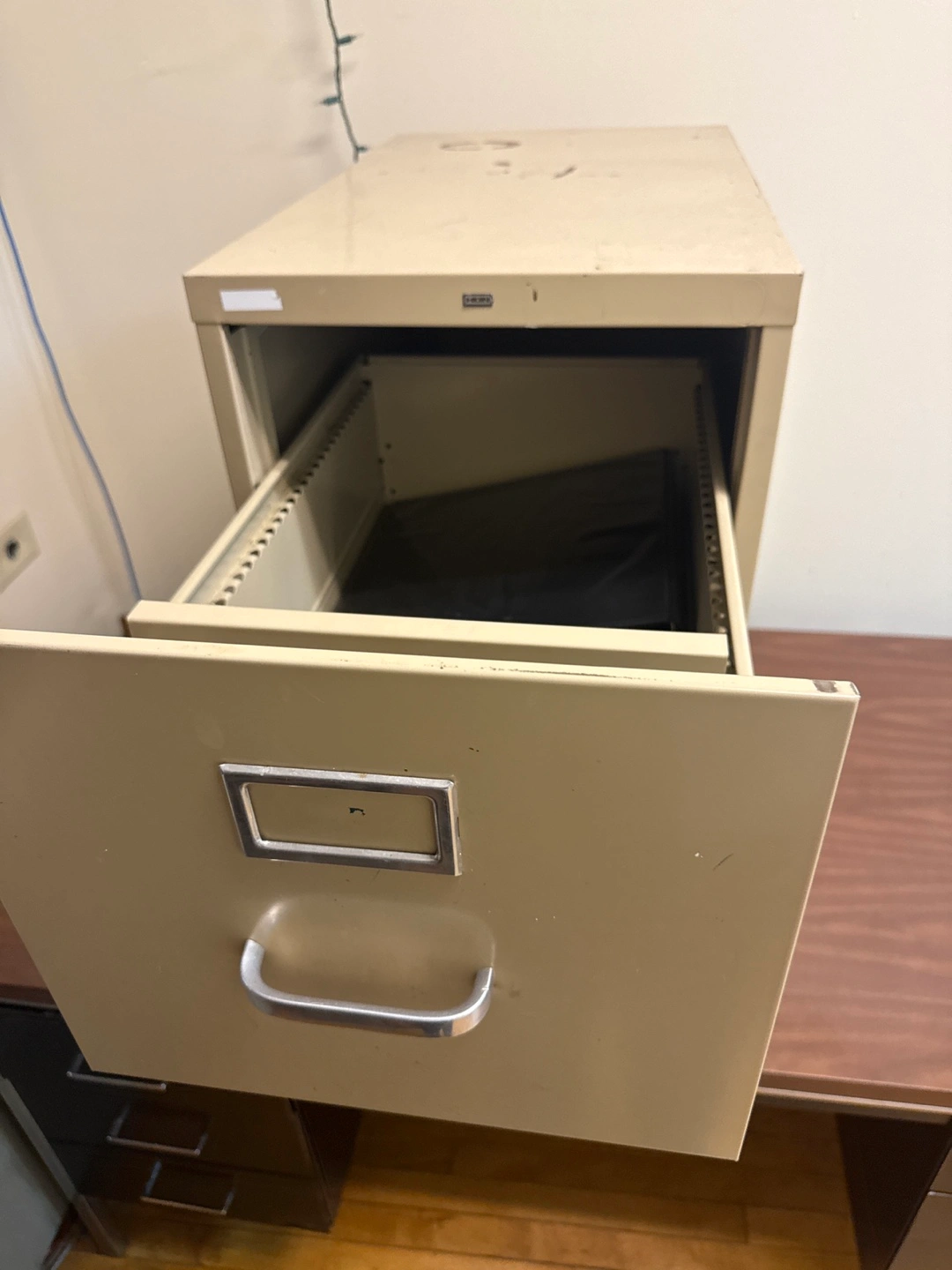 Here's a sturdy metal filing cabinet! It's a beige color and has two drawers for organizing all your important documents. Perfect for a home office or workspace 15 inches wide 29 inches high 25 inches deep