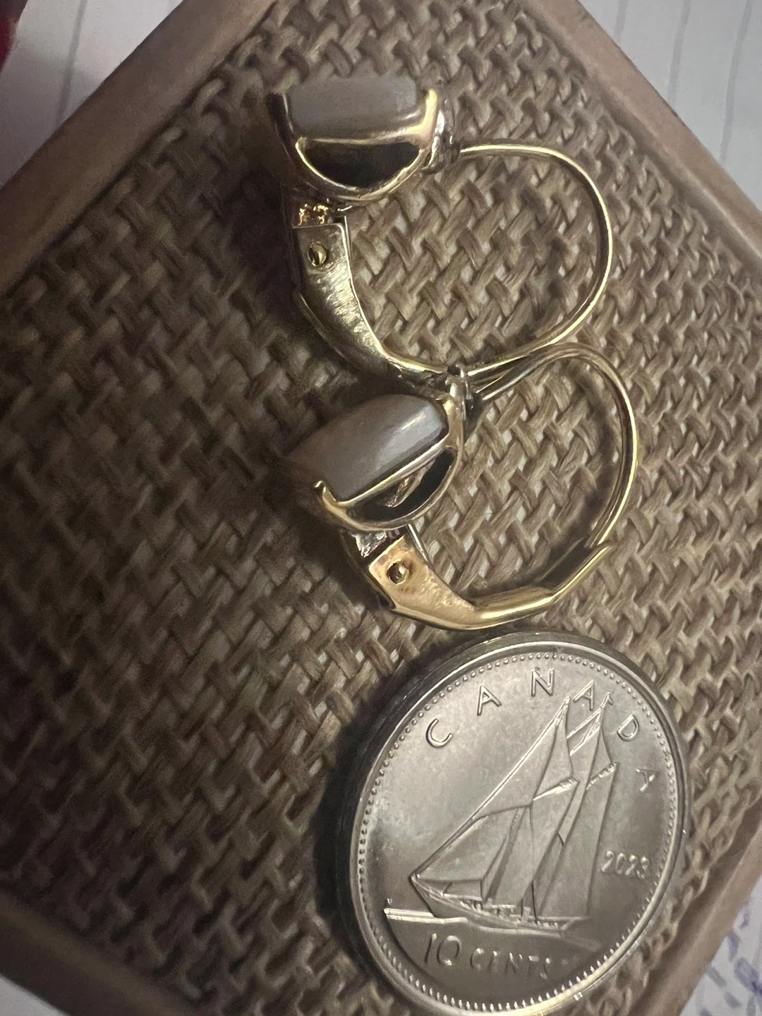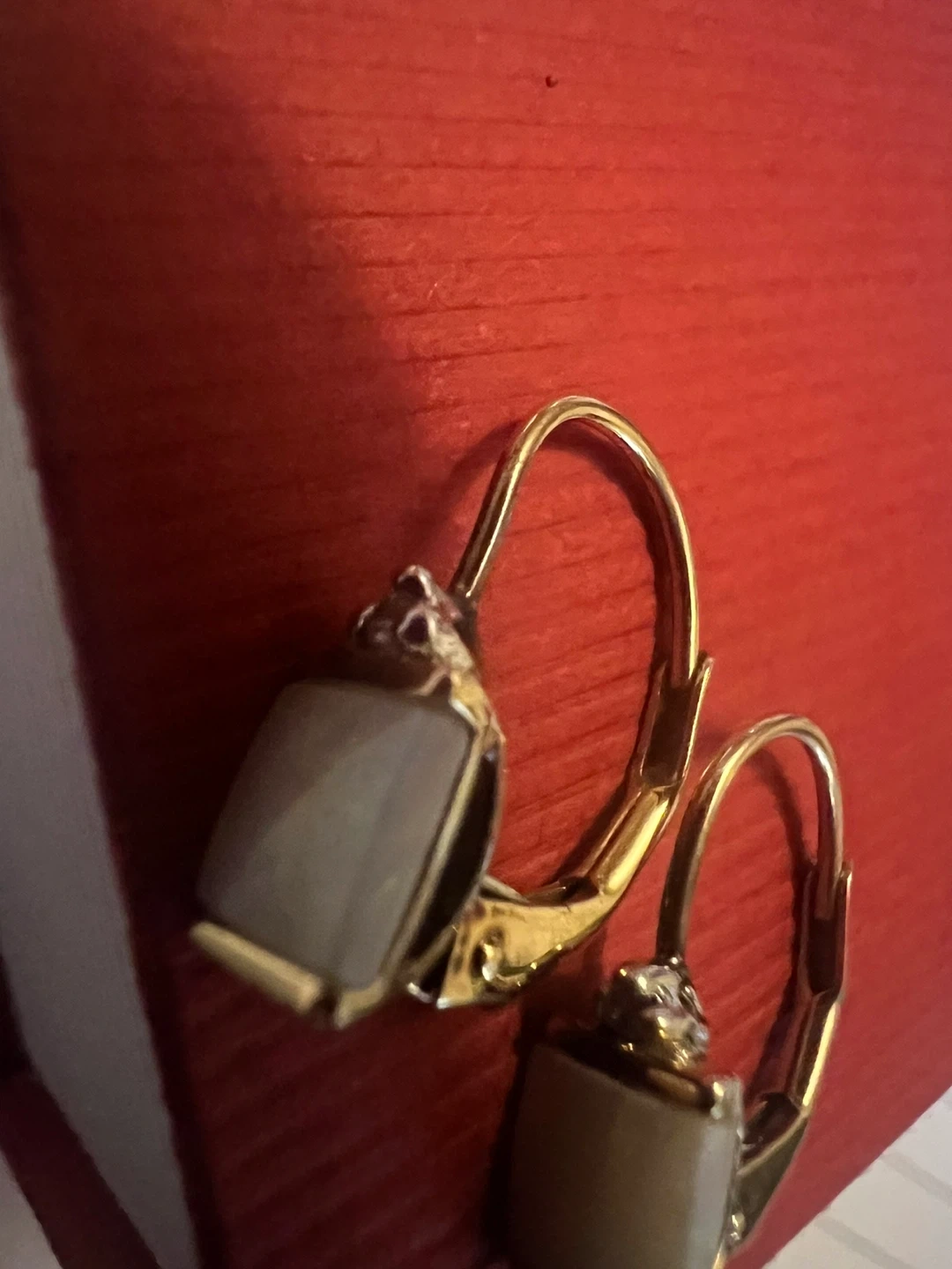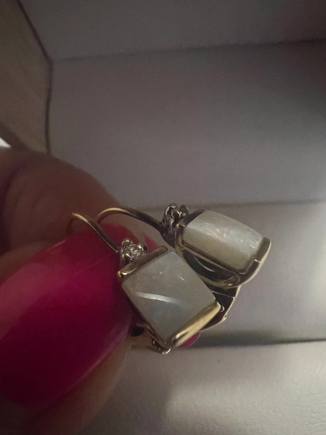 Selling a pair of 10 k opal and diamonds earrings. They have a gold-tone finish and a stone detail