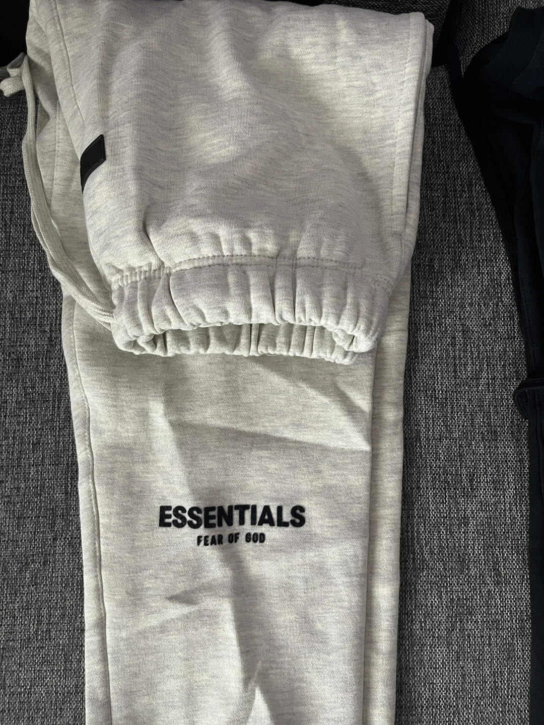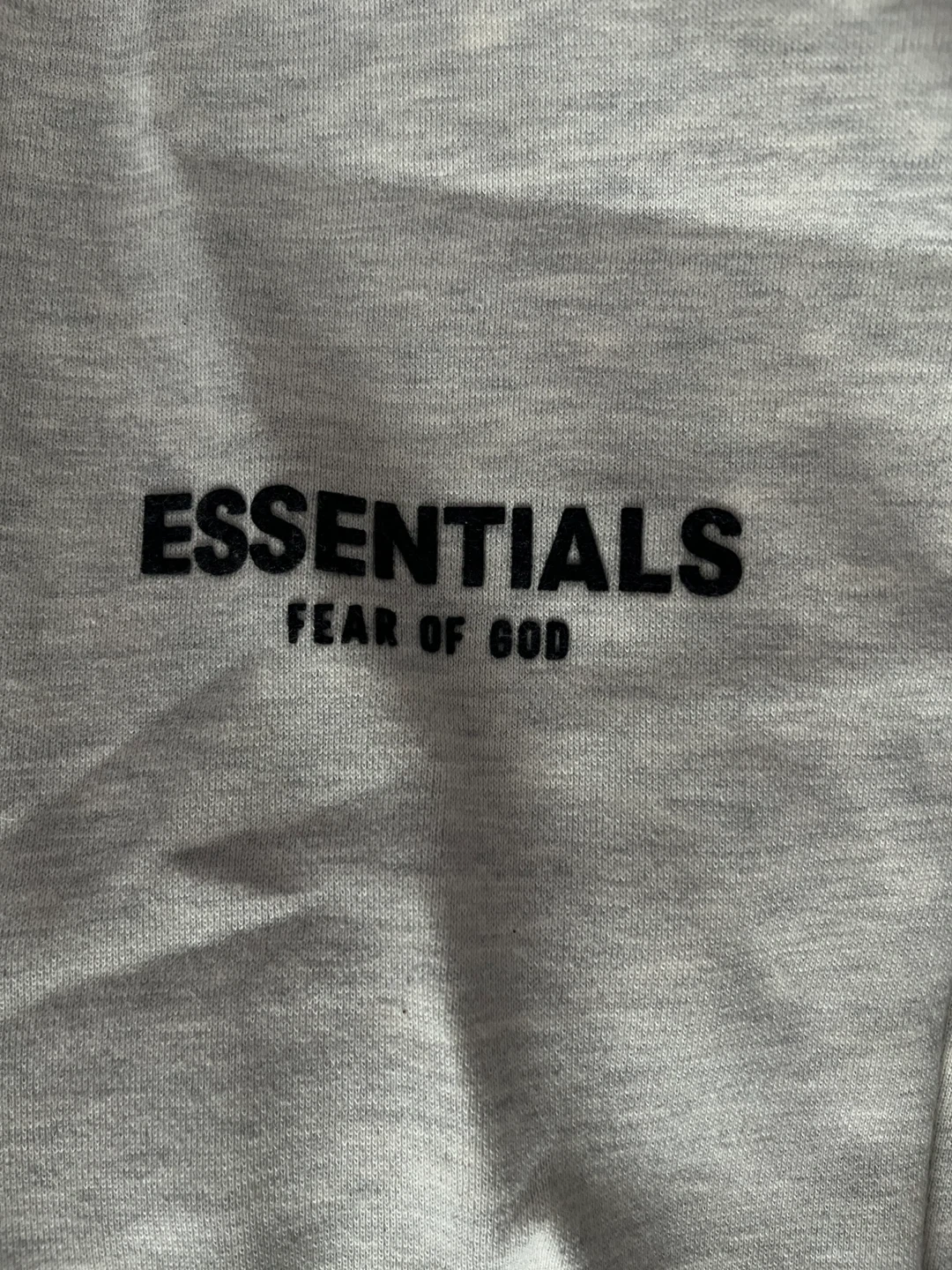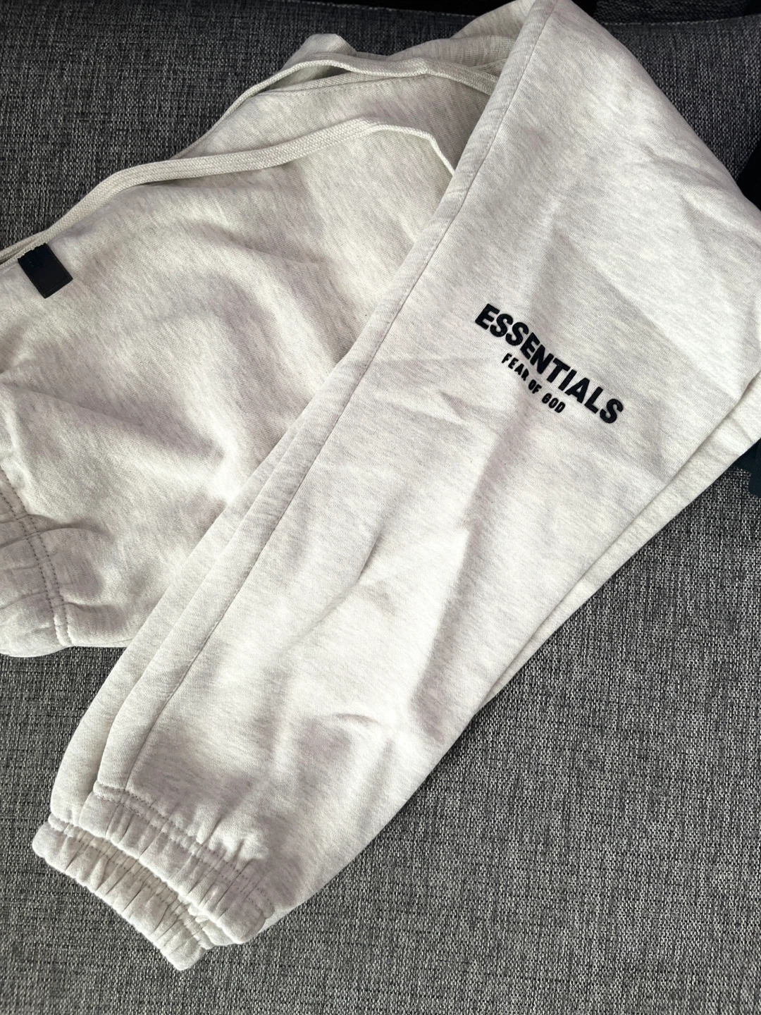 Selling a pair of Essentials Fear of God sweatpants. They are a light grey colour with the brand name printed on the leg. Great for lounging around the house or running errands!