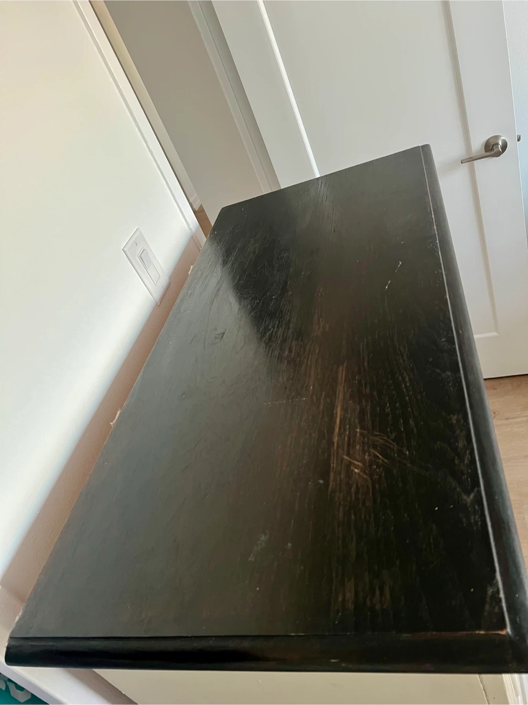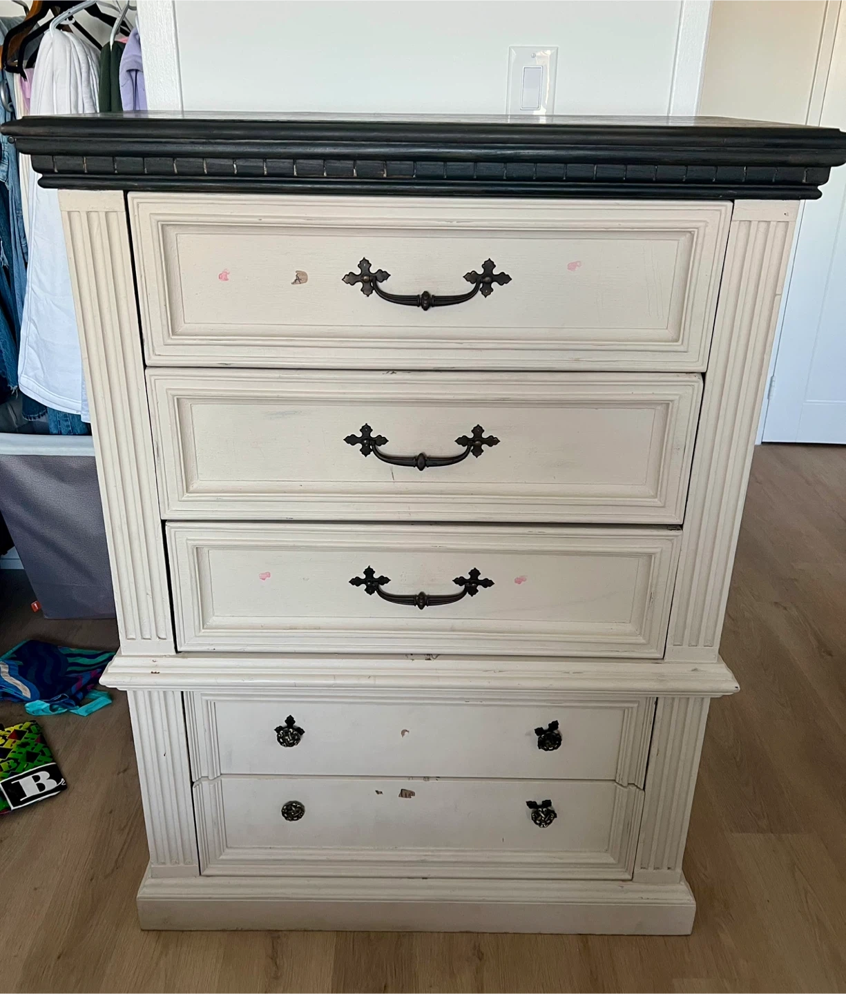 Selling a Dresser with a white body and a black top. It has some signs of wear, including a few marks on the drawers, but is still sturdy and functional. Perfect for adding some storage space to your bedroom or living area. Pick up in Burlington.