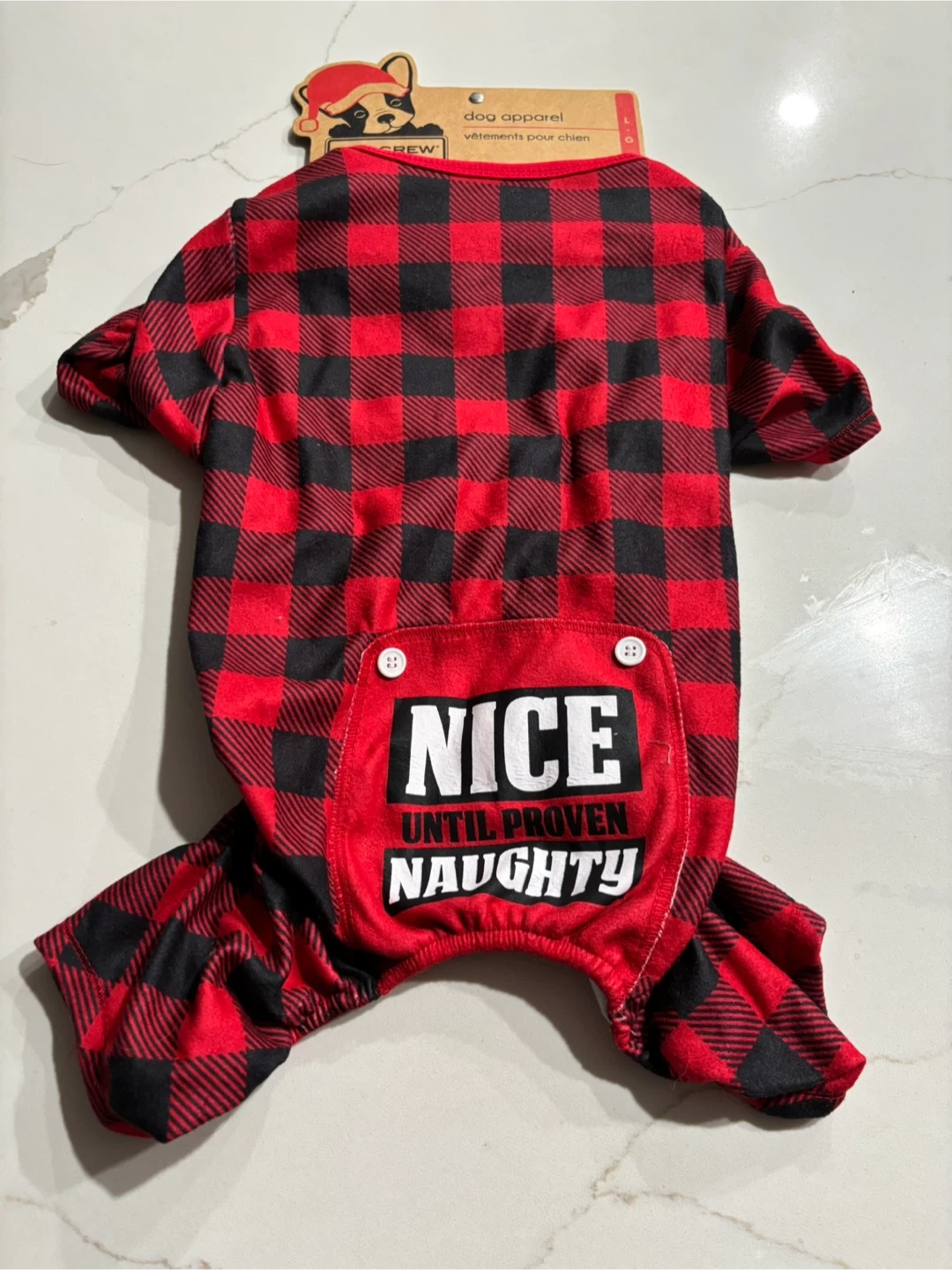 Keep your furry friend cozy with this adorable Pup Crew dog apparel! It's red and black plaid with a cute "Nice Until Proven Naughty" design on the back pocket. Size large, perfect for dogs with a chest girth of 21-24 inches. Originally priced at $12.99 U.S.