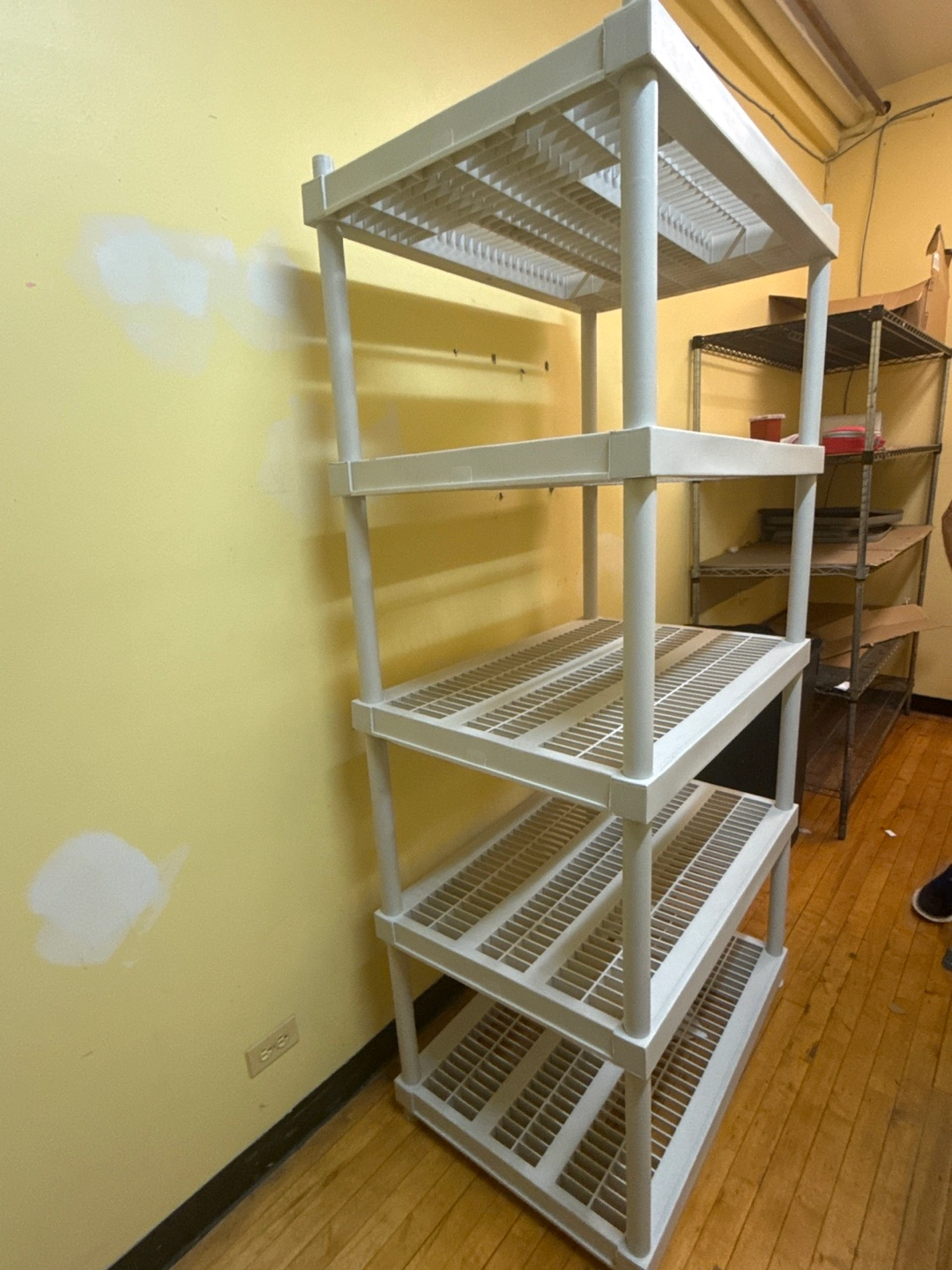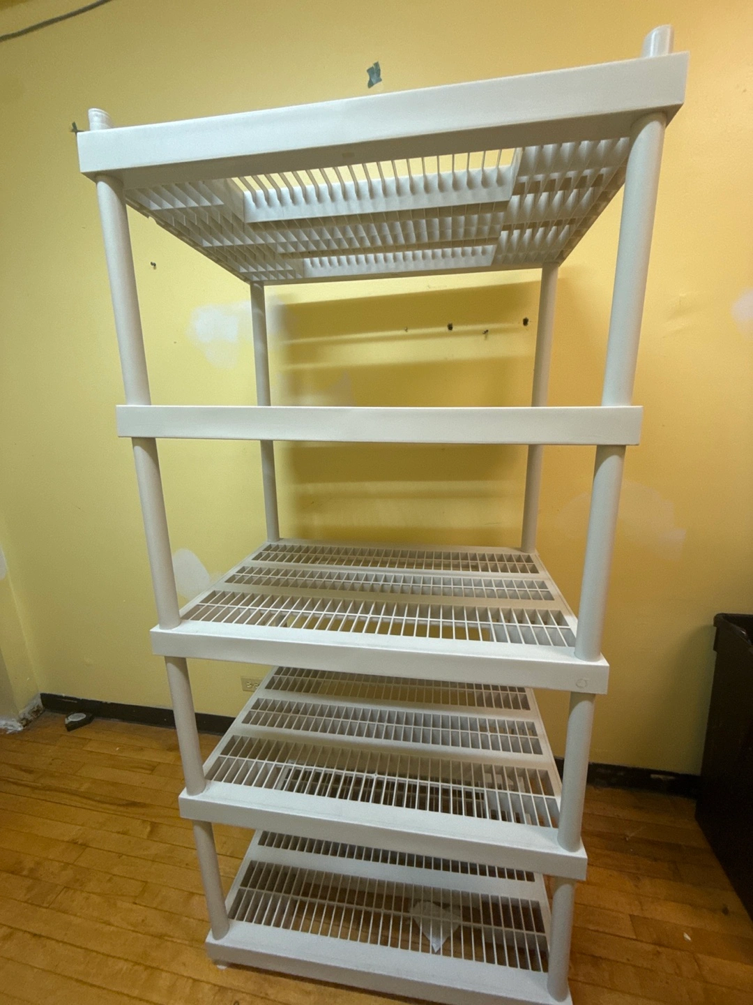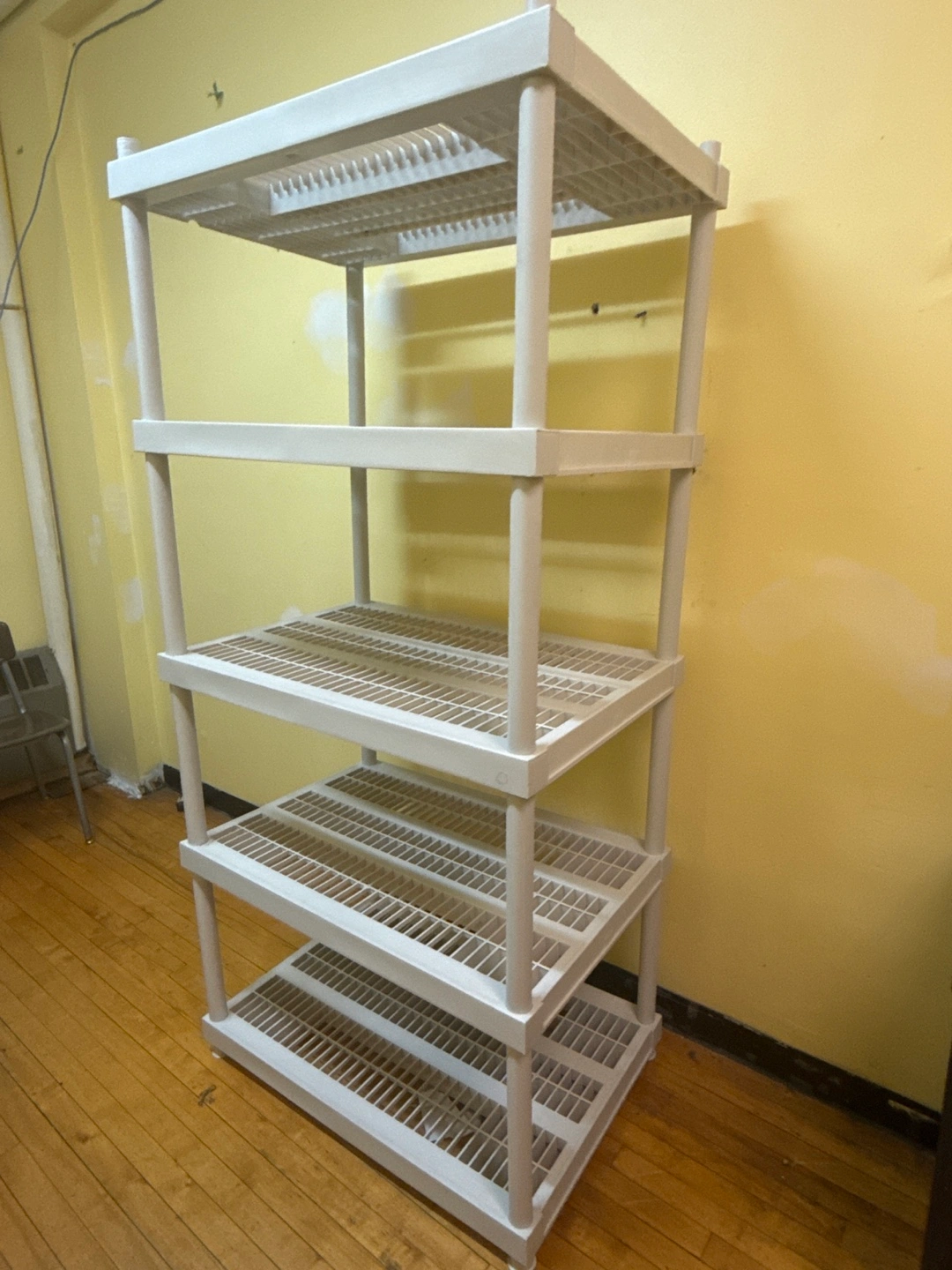 Selling a white plastic 5-tier shelf. It's great for organizing items in your home, garage, or storage area. The shelf is in good condition and ready for a new home. 36 inches wide 24 inches deep 74 inches high.
