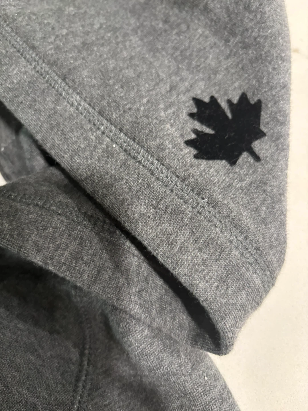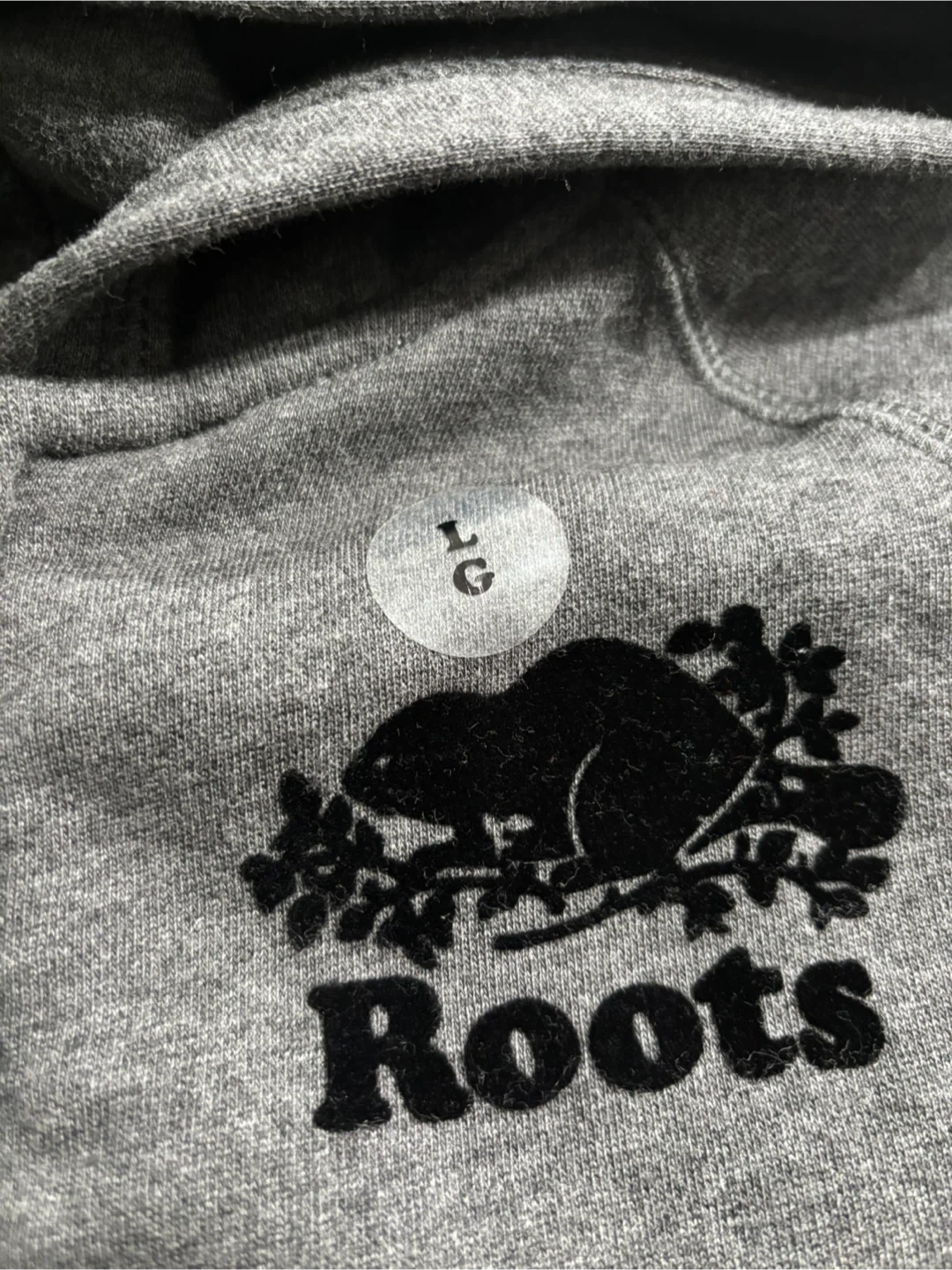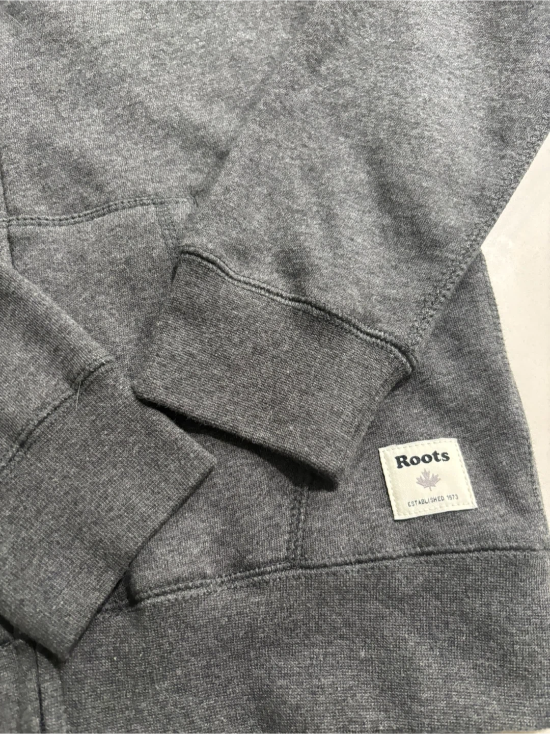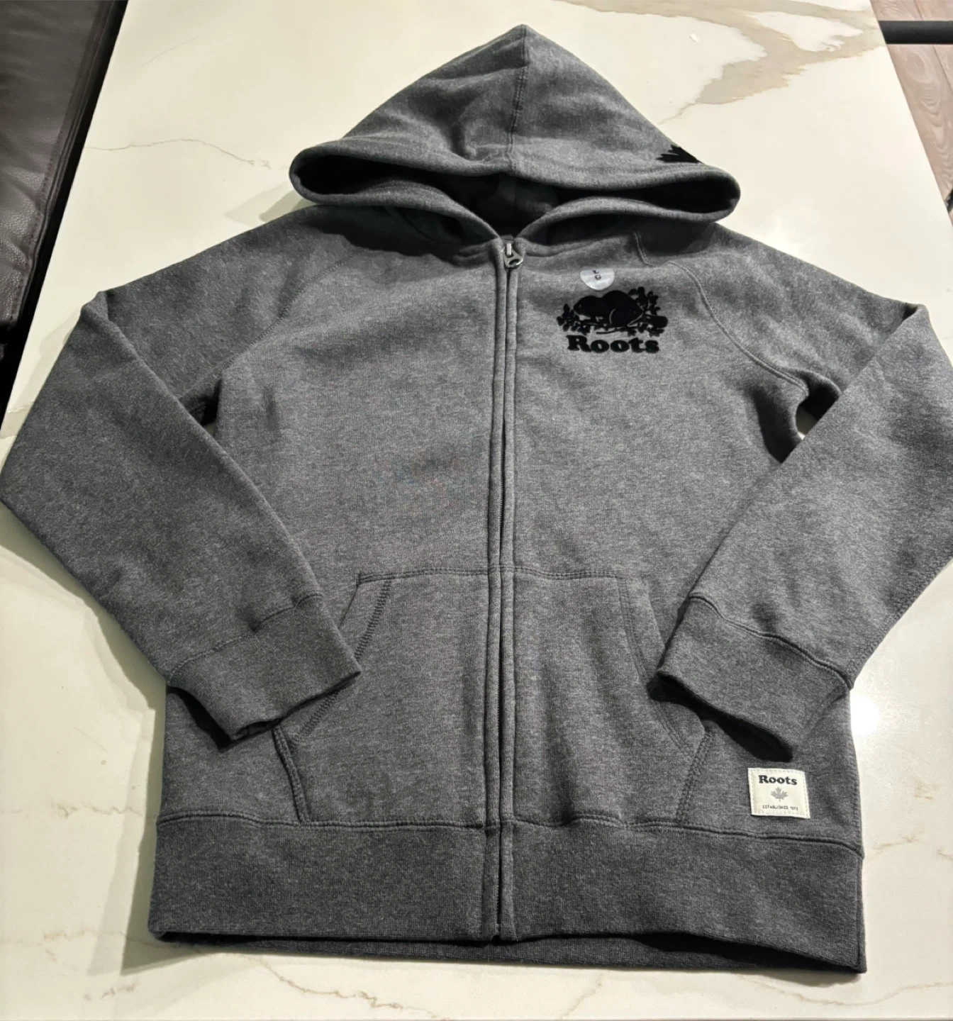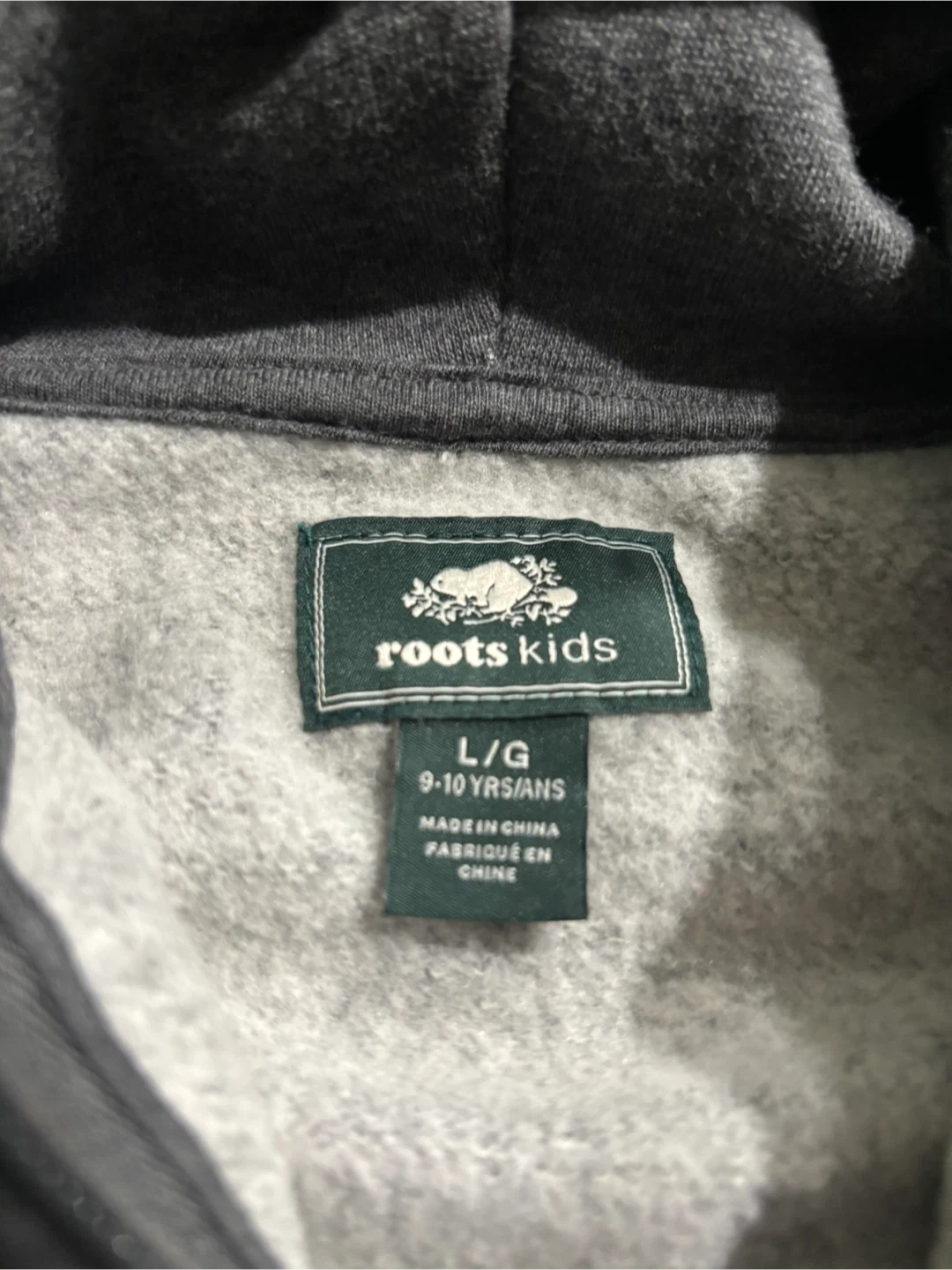 Selling a New Roots Kids zip-up hoodie in grey. It's a size L, suitable for kids aged 9-10 years. Size tag still on. Features the classic Roots logo. Perfect for keeping your child warm!