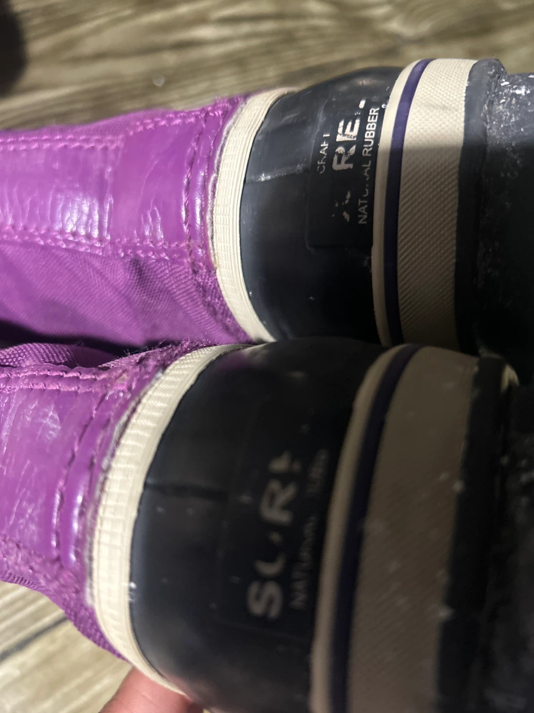 These are a pair of purple Sorel winter boots. They are in good condition and ready for the snow! Size 3