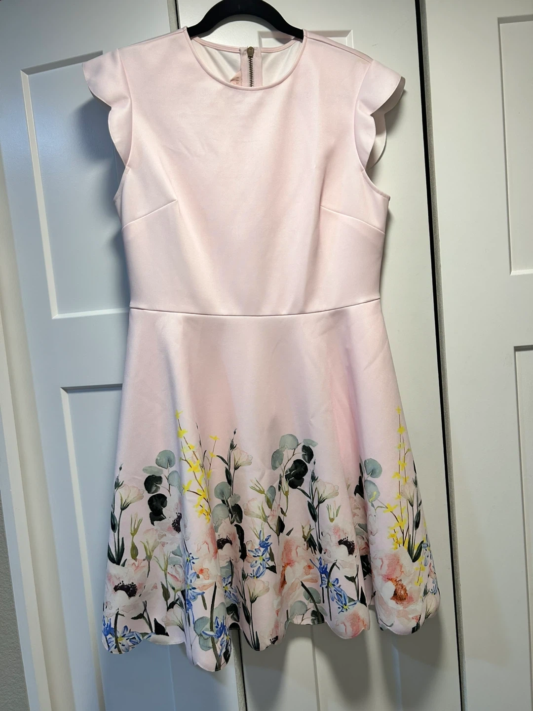 Beautiful Ted Baker pink floral minidress with scalloped detail on bottom hem and sleeves. No signs of wear except tiny dot or 2 on inside lining as shown in picture. It’s a size 4 UK which is equivalent to a M in US.