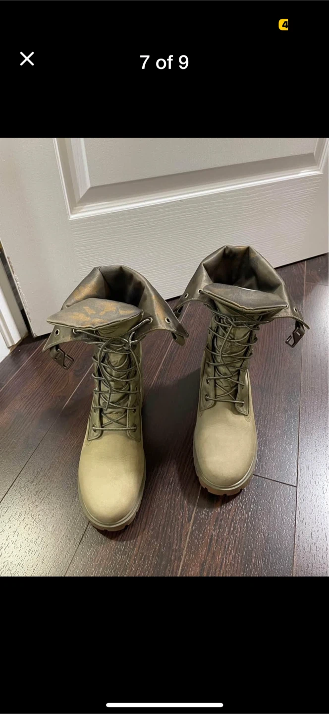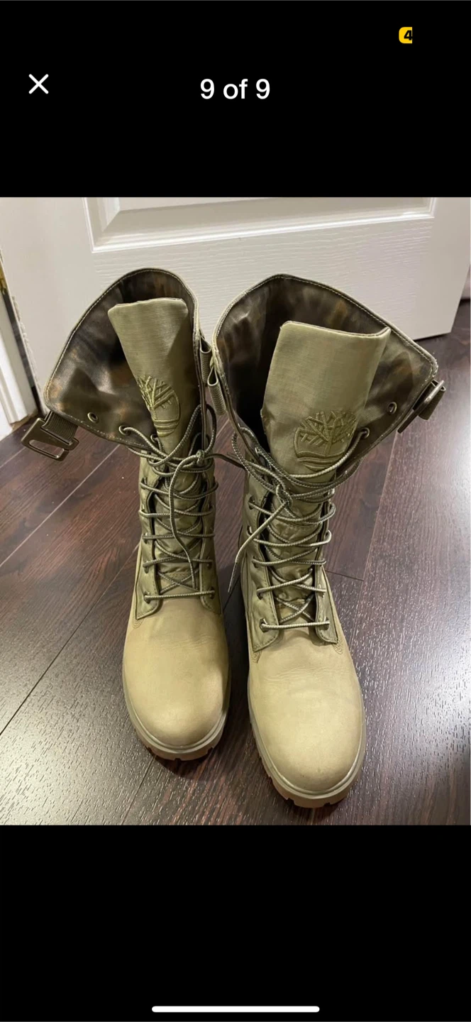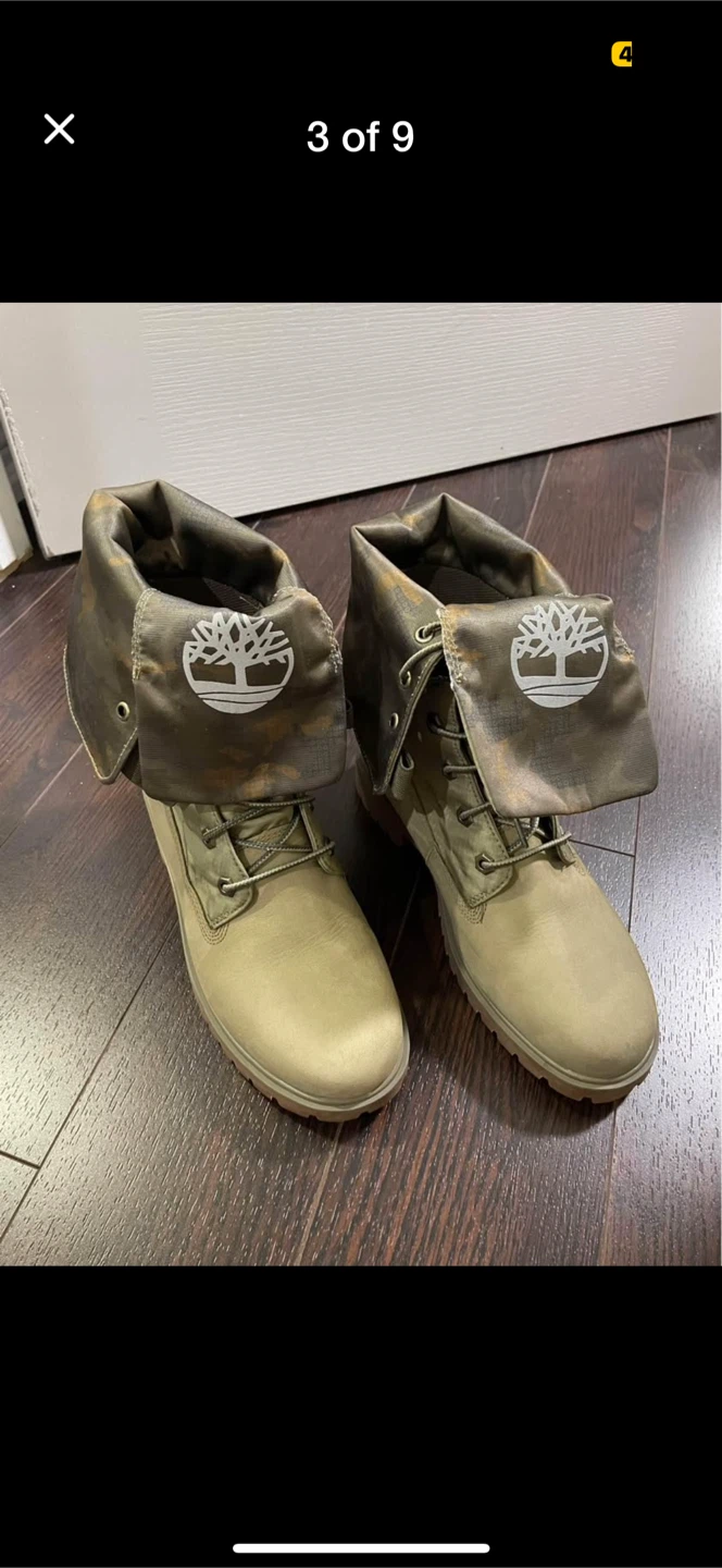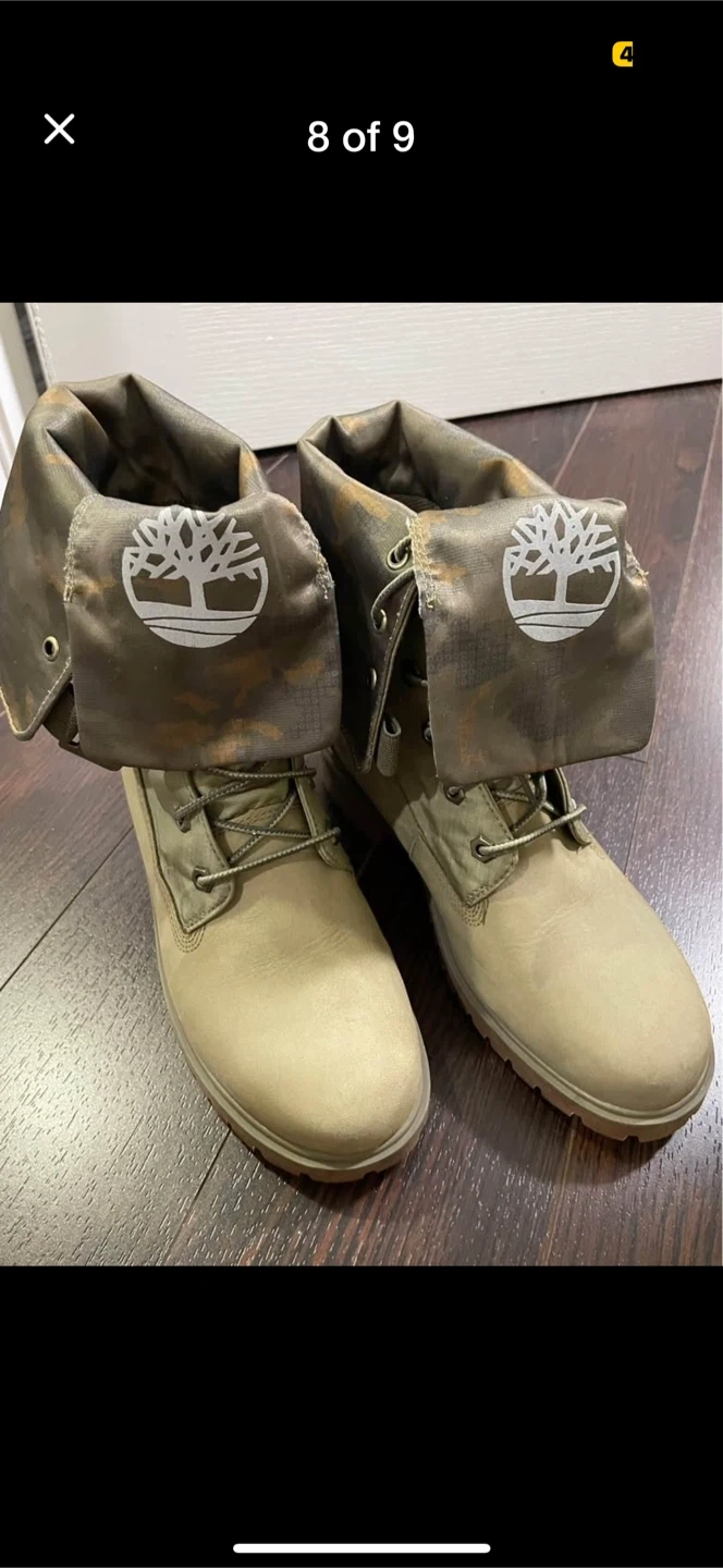 Timberland limited edition boots š„¾ size 7 womenās, size 5.5 menās green leather. They can be rolled down to show off the feature of camouflage interior.