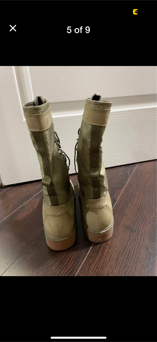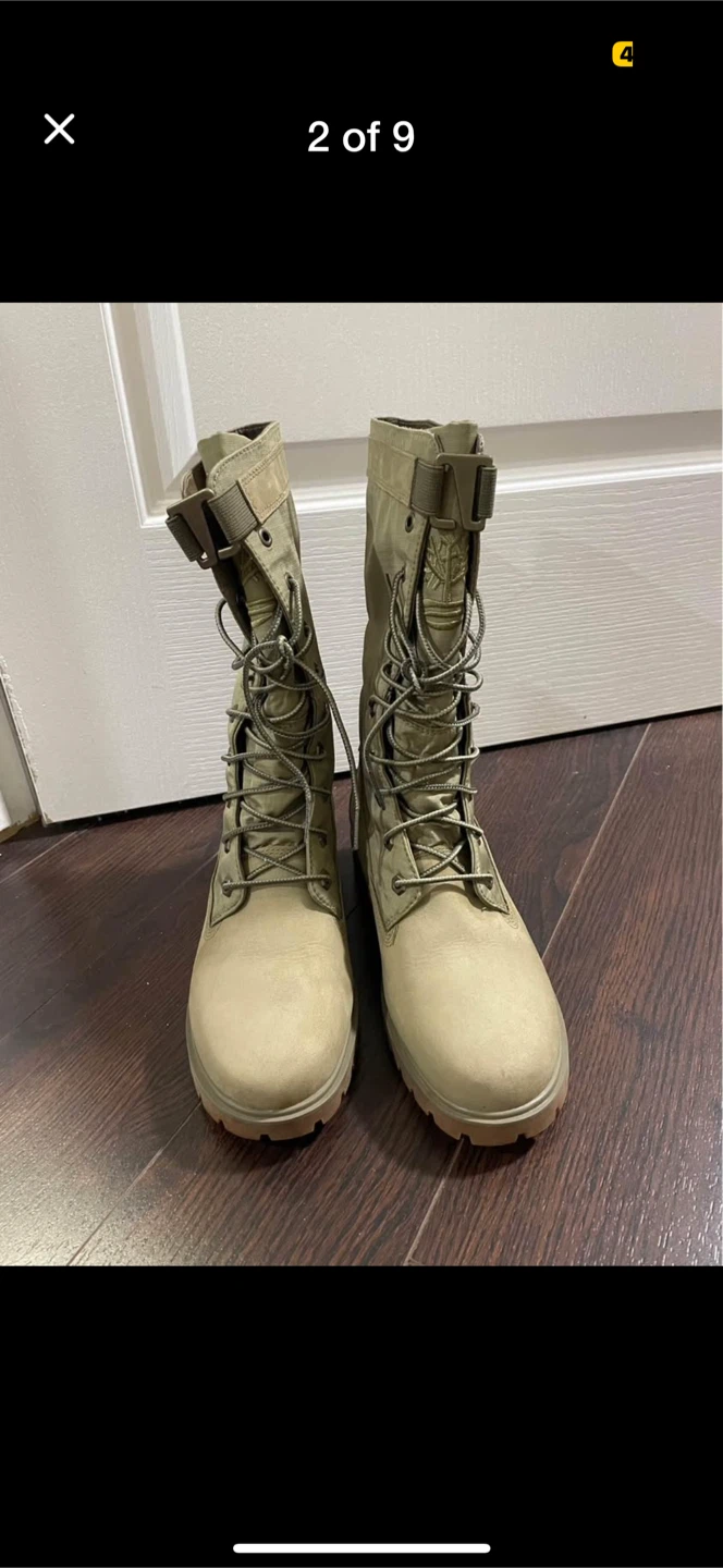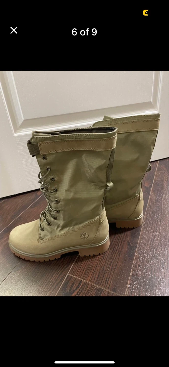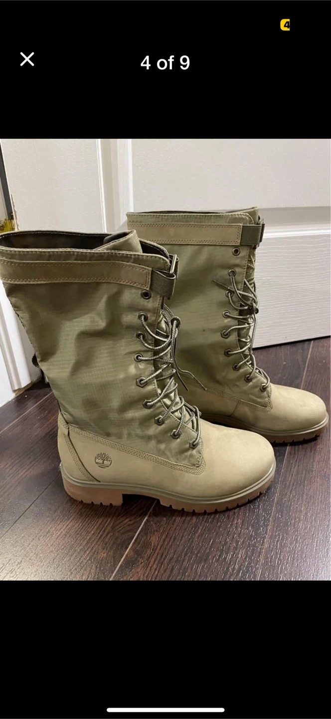 Timberland limited edition boots š„¾ size 7 womenās, size 5.5 menās green leather. They can be rolled down to show off the feature of camouflage interior.