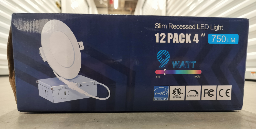 Selling a 12-pack of Slim Recessed LED Lights, each 4 inches in diameter. They output 750 lumens and use 9 watts. The colour temperature is adjustable, with options for 2700K, 3000K, 3500K, 4000K, 5000K, 6000K, 3CCT, and 5CCT. Dimmable. The box is included