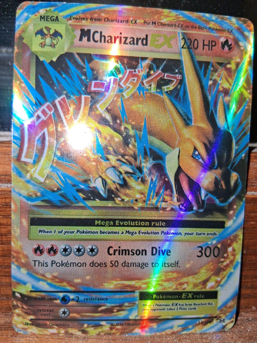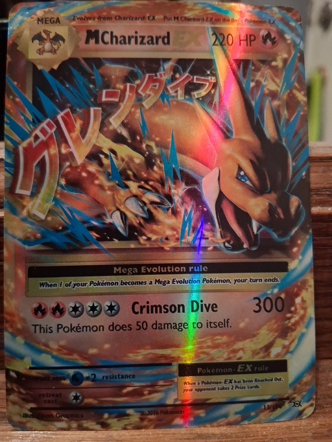 Selling an M Charizard EX Pokemon card. It has 220 HP and the attack Crimson Dive does 300 damage. This Pokemon does 50 damage to itself