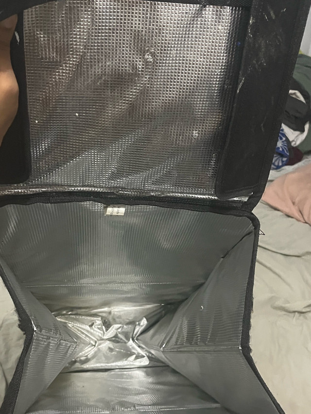 This is a used Longos cooler bag, perfect for keeping your items cool on the go. It has seen some use, as you can tell, but is still functional and ready for more adventures. There are some marks and wear, which is reflected in the price. Unfortunately I do not have the exact specs on this unit. Why not give this cooler bag a new lease on life? Remember, if you're seeing this ad, the cooler bag is still available and waiting for you! Good for UberEats, DoorDash, Instacart for those who want an additional bag for multiple orders at once.