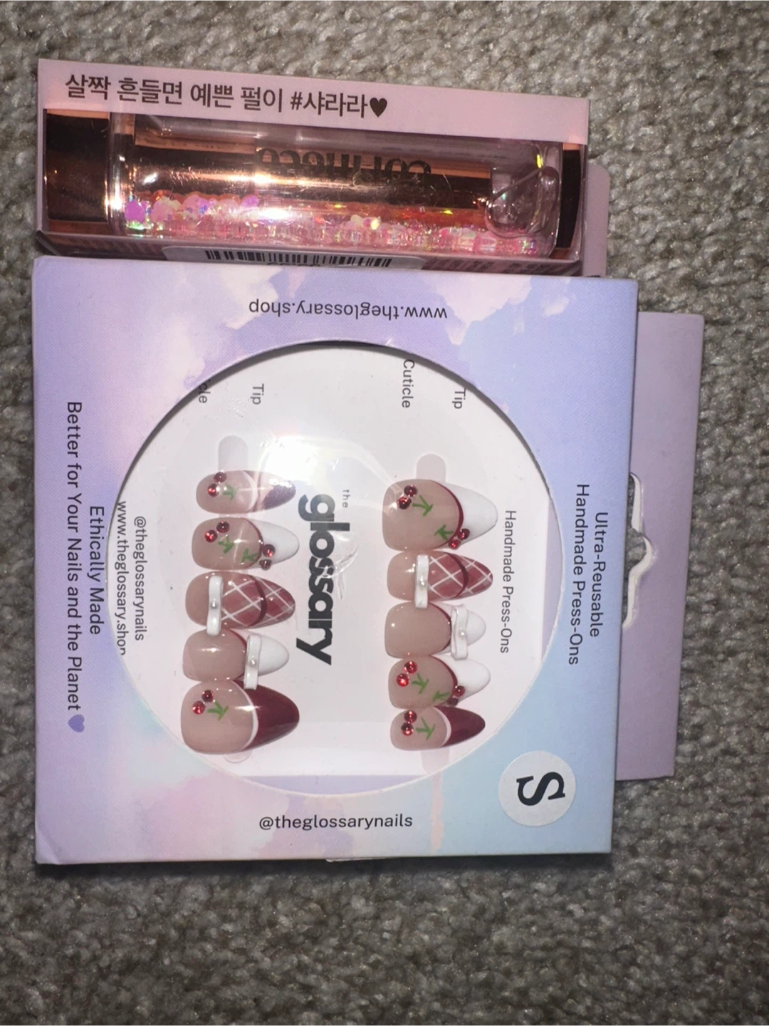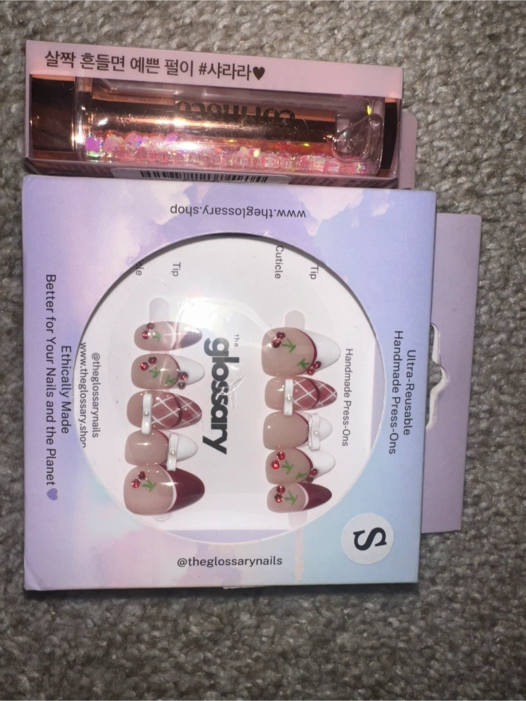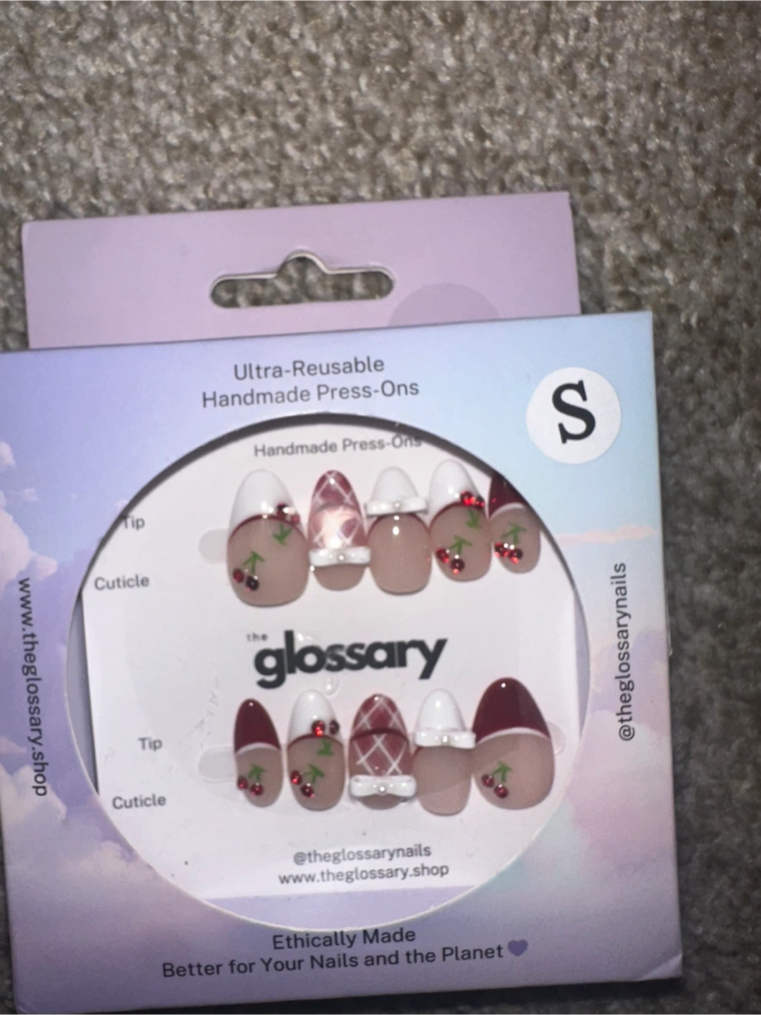 Selling a set of ultra-reusable, handmade press-ons from The Glossary! These are in size small and feature a cute cherry design. Ethically made and better for your nails and the planet! Plus u can get a lip balm for free if u buy this