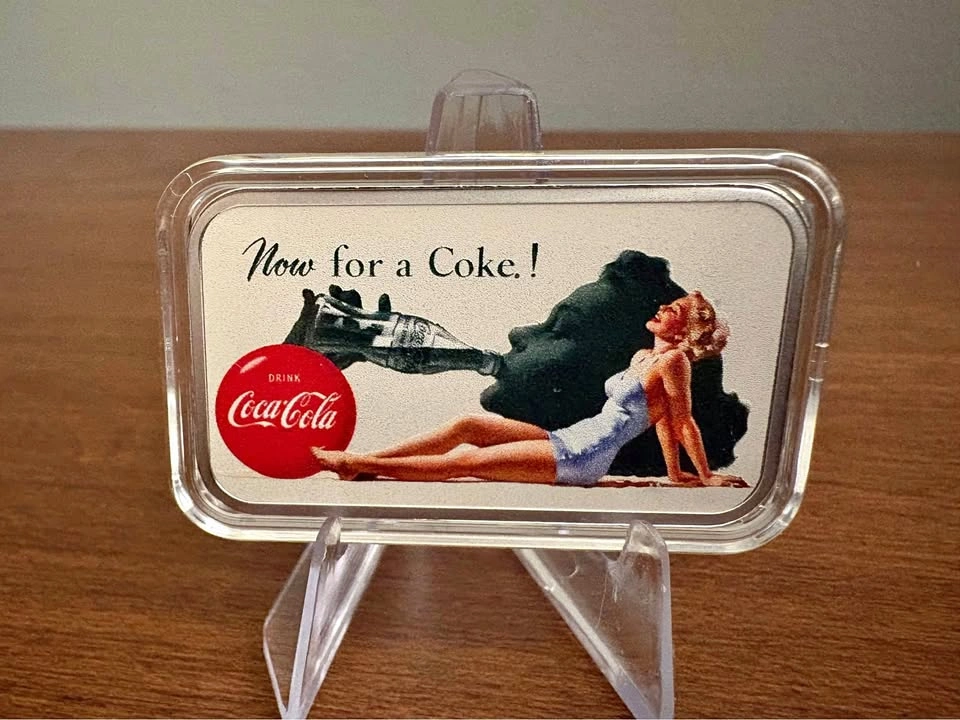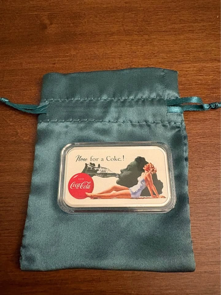 1 oz .999 pure/fine silver bullion bar featuring a vintage Coca Cola theme. In Brilliant uncirculated condition and housed in a hard protective capsule. Also comes with a satin drawstring gift-pouch.