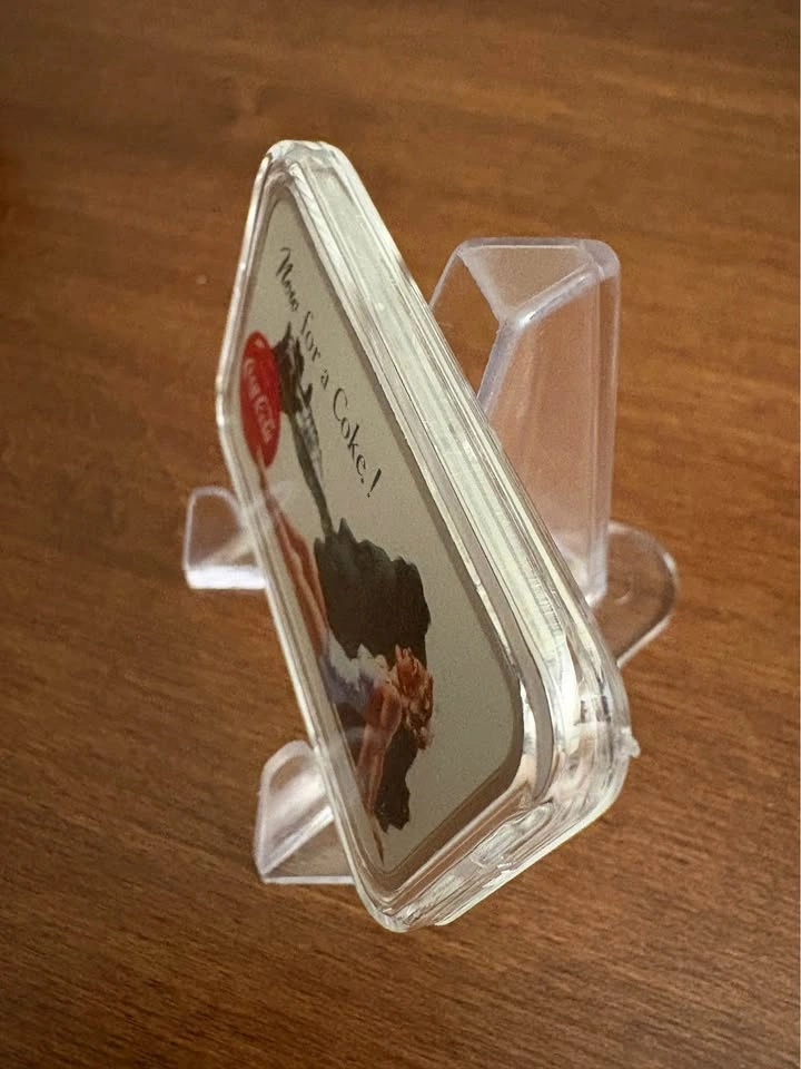 • Obverse: Features a vintage image of a blonde woman horizontally posed in a blue bathing suit with a close-up image behind her drinking from a Coke® bottle with "NOW FOR A COKE!"