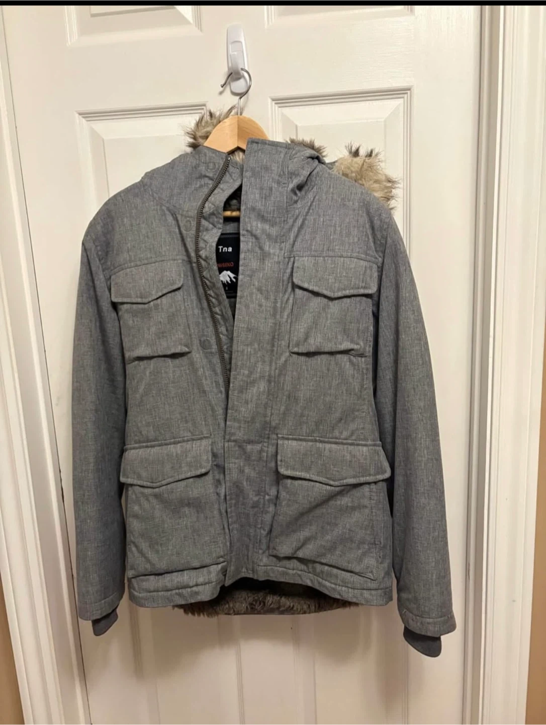 25Selling a TNA brand winter parka in a stylish grey colour! It's perfect for keeping warm during the colder months. The parka features a faux fur trim on the hood and multiple pockets for your convenience. It's in great condition and ready for a new owner!